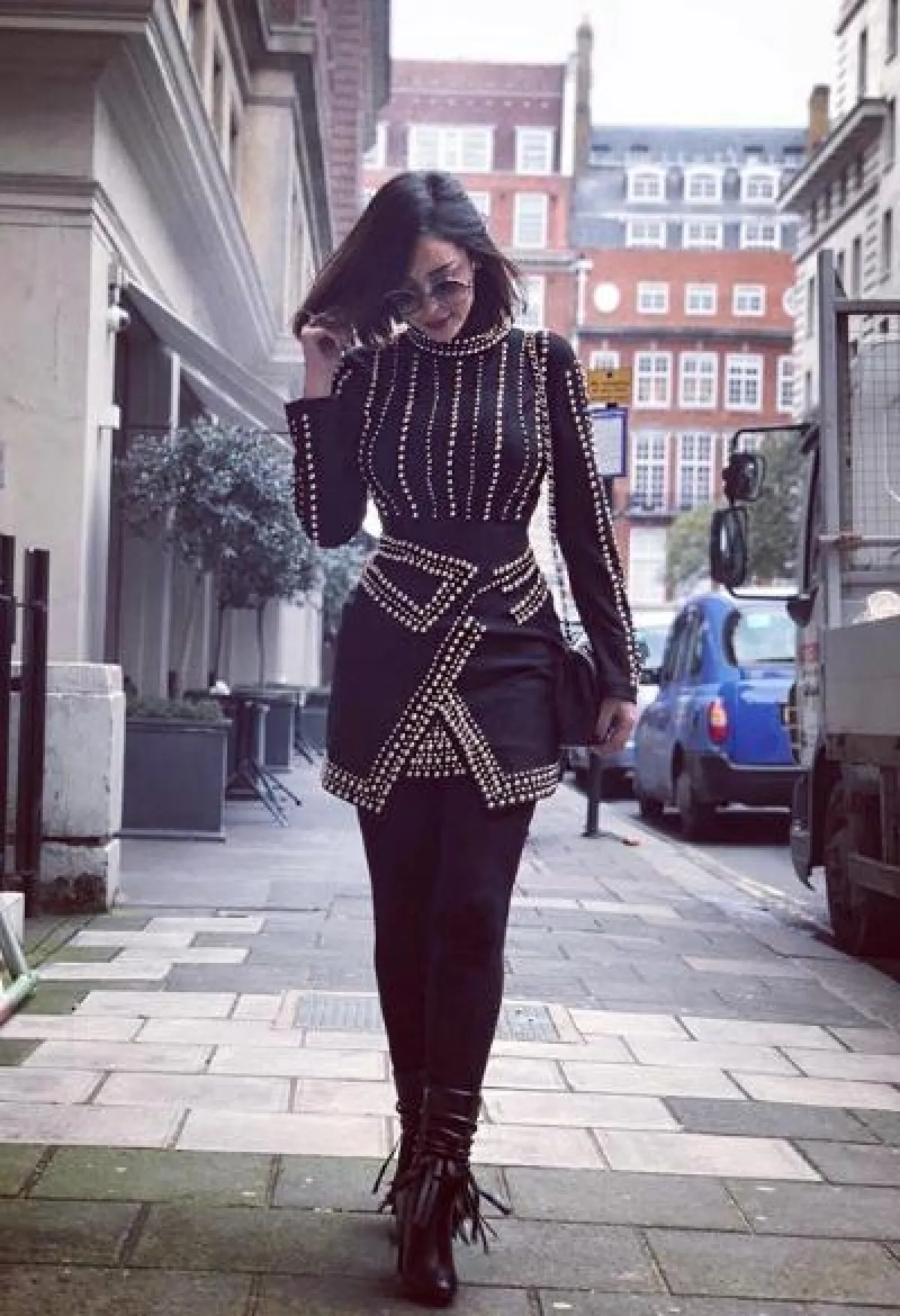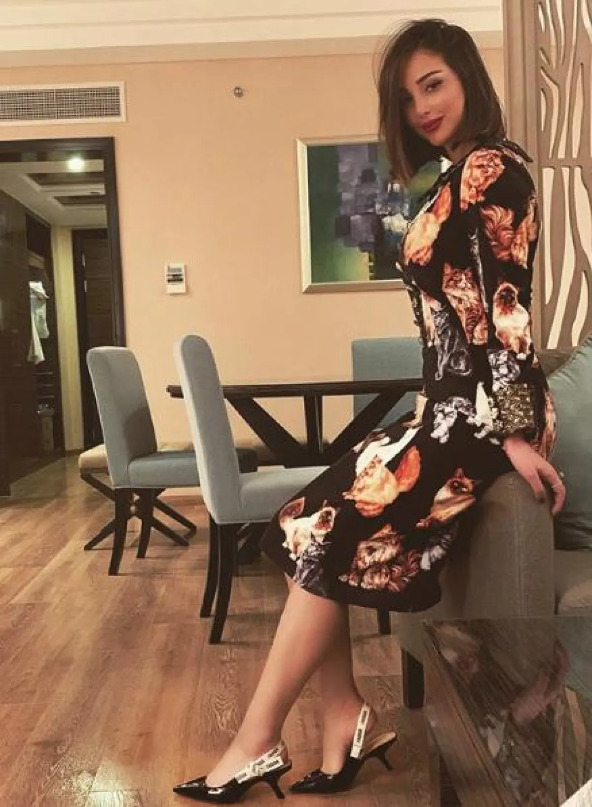 أحد اطلالات بسمة بوسيل الغريبة واللافتة، كانت في هذا الفستان المعرق، والتي وللوهلة الأولى تبدو عادية، لكن بعد التمعن بها نلاحظ أنّ الفستان مُطبّع برسومات لقطط مختلفة الأحجام والألوان، وقد نسقت معه حذاءً أسود بكعب منخفض من “ديور” Dior.