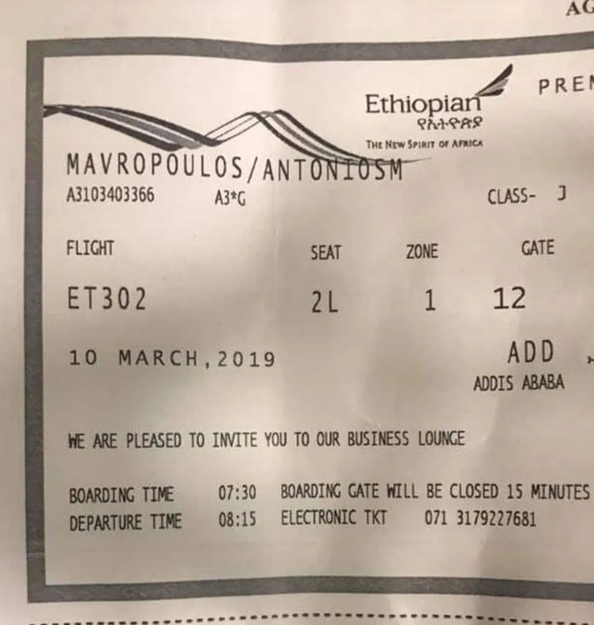 مثل العديد من الضحايا، كان السيد «مافروبولوس» في طريقه إلى نيروبي، كينيا، لحضور الاجتماع السنوي لبرنامج الأمم المتحدة للبيئة، وقال «مافروبولوس»، رئيس جمعية النفايات الصلبة الدولية غير الهادفة للربح، إنه غاب عن الطائرة لأنه كان متأخراً، وأغلقت البوابة بعد دقيقتين فقط من وصوله ومنعه موظفو المطار من الصعود إلى الطائرة، فاحتج ونظر من خلال النافذة حيث استقر الركاب في مقاعدهم، حيث كان من المفترض أن يجلس في مقعد 2L في درجة رجال الأعمال في الجزء الأمامي من الطائرة، وأقلعت الطائرة بدونه في الرحلة التي تستغرق ساعتين من أديس أبابا إلى نيروبي، واشتكى السيد «مافروبولوس» لكنه اقتيد بعيدًا. وقاده أمن المطار إلى مركز الشرطة في المطار حيث قال له الضابط بألا يحتجّ بل يصلي إلى الله لأنه الراكب الوحيد الذي لم يركب الرحلة ET302 التي فُقدت، وأرادت الشرطة استجوابه لمعرفة سبب عدم وجوده على متن الطائرة، ثم بدأ الاتصال بعائلتة ليعرفوا أنه لم يكن على متن االطائرة وأنه لا يزال على قيد الحياة.