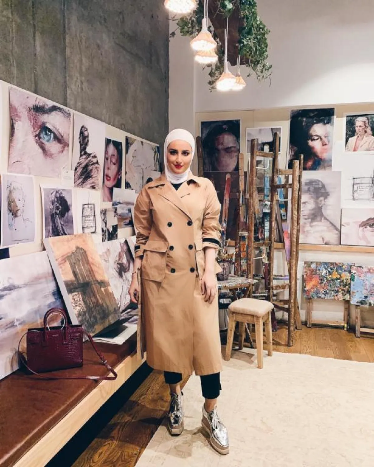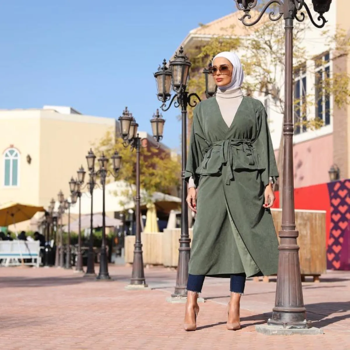 اعتمدت المدونة المحجبة مرمر معطف ماكسي من خامة الكتان القطن، مزينًا بـ حزام الخصر مع جيوب كبيرة الحجم أضافت للتصميم لمسة كاجوال، كذلك لونه الكاكي المائل إلى الزيتوني.
