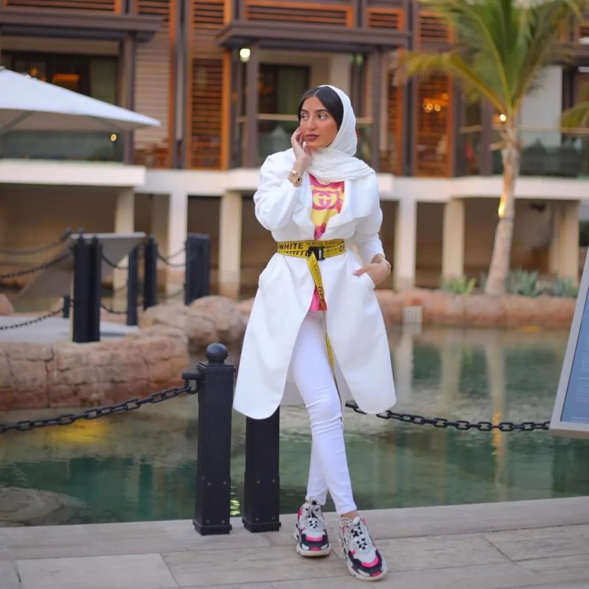ذهبت المدونة ماهي إلى معطف أبيض بقصة الصدر المهدل، ونسقته مع اطلالة بيضاء بالكامل، كما انتعلت حذاءً رياضيًّا ضخمًا من صيحة الأحذية القبيحة الرائجة هذا الموسم.