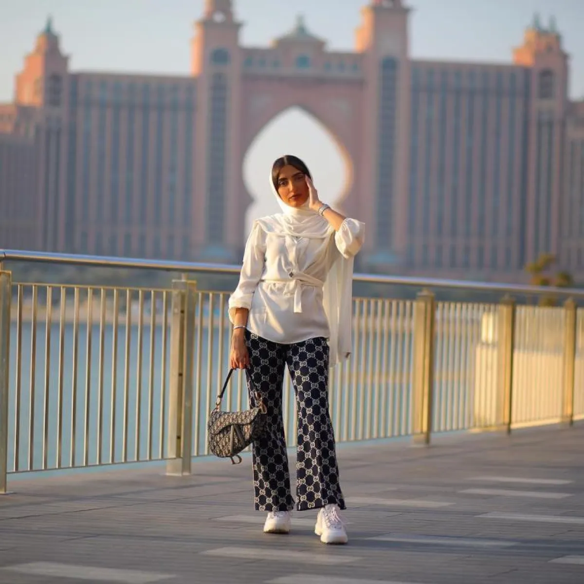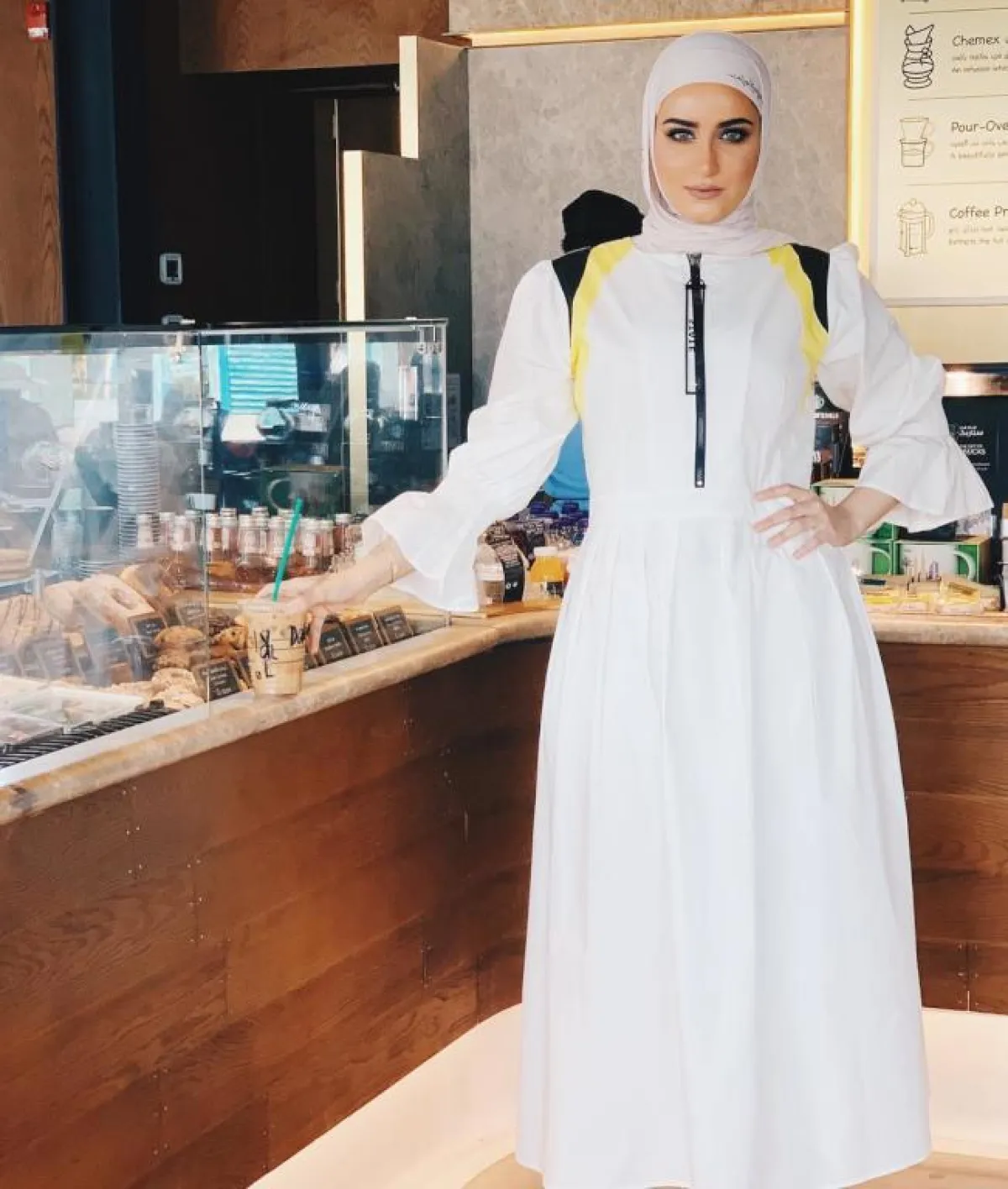 اختارت المدونة دلال الدوب أيضًا صيحة الفساتين المكسرة، من خلال فستان أبيض ماكسي مزدان بتنورة منفوشة بشكل محدود، أما الأكمام فجاءت بتصميم الجرس الذي شهد رواجًا ضخمًا العام الماضي.