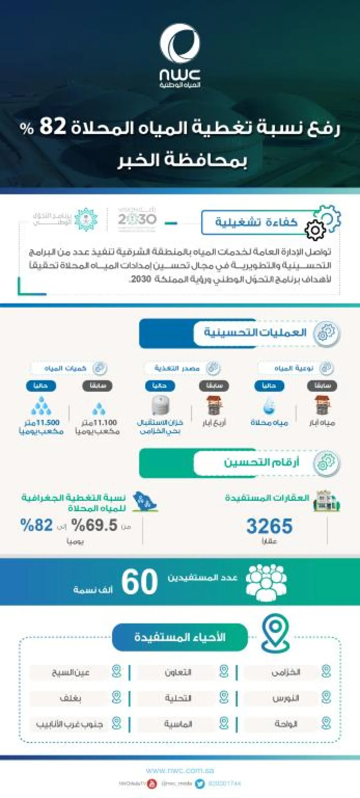 أعلنت شركة المياه الوطنية بدء ضخ المياه المحلاة إلى أحياء جنوب محافظة الخبر (الخزامى- النورس- الواحة- التعاون- التحلية- الماسية- عين السيح- جنوب غرب الأنابيب- بغلف) بكميات تقدر بـ 11.5 ألف متر مكعب يومياً، وتغطية ما يقارب (19) مليون متر مربع من مساحة العقارات دون أي زيادة في الكميات اليومية من قطاع الإنتاج؛ وذلك بعد تبني الإدارة خطة ذاتية توسعية وتنظيمية في أحياء جنوب محافظة الخبر.