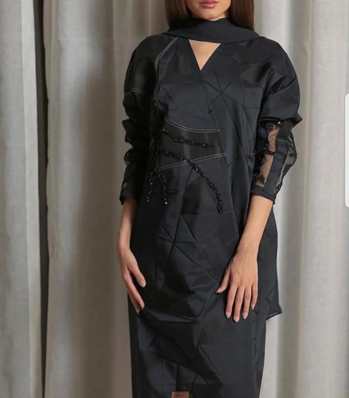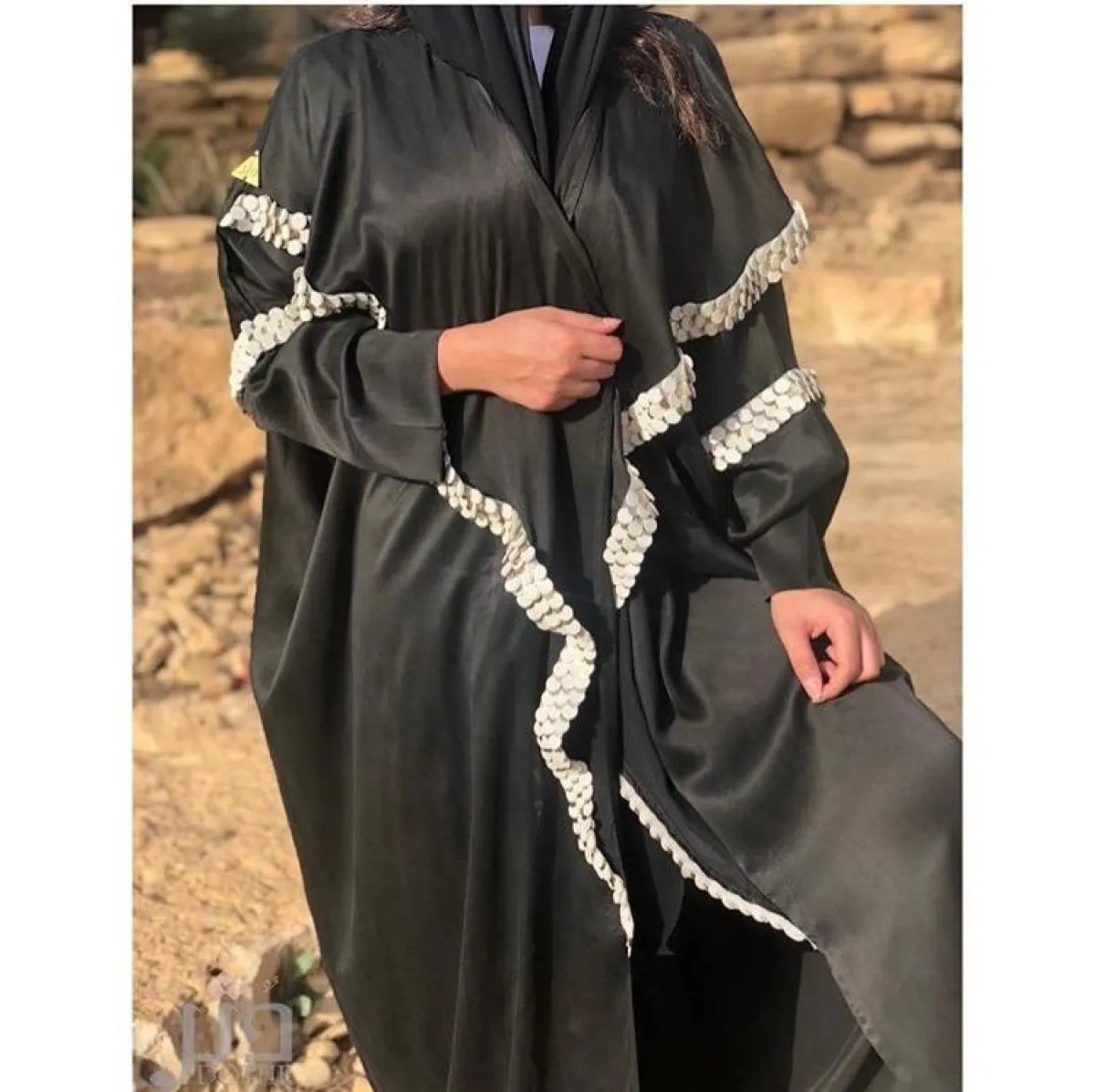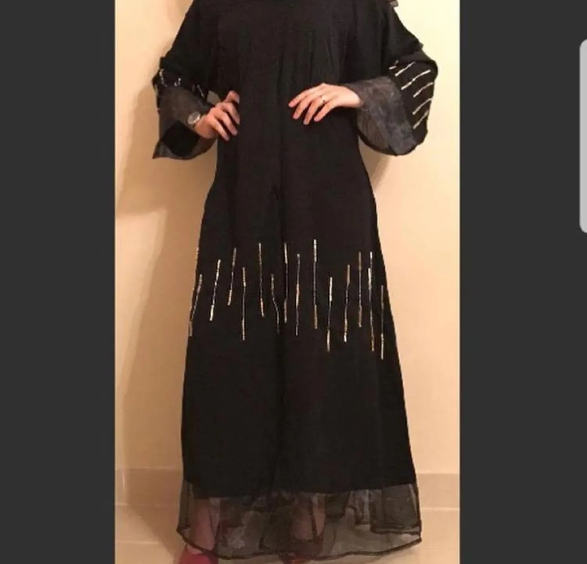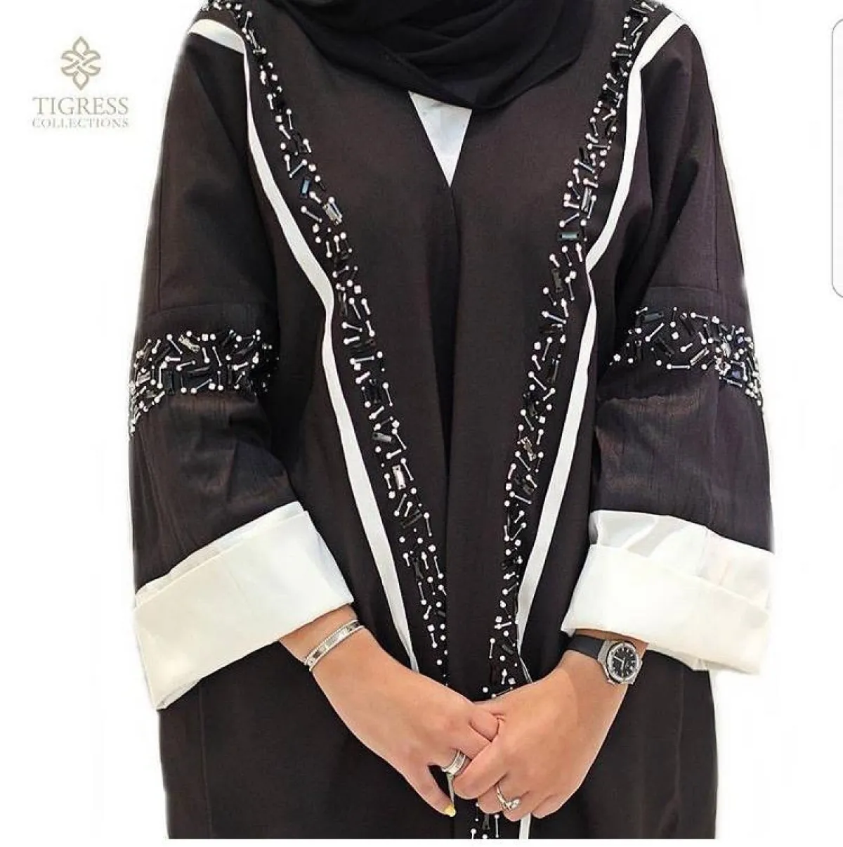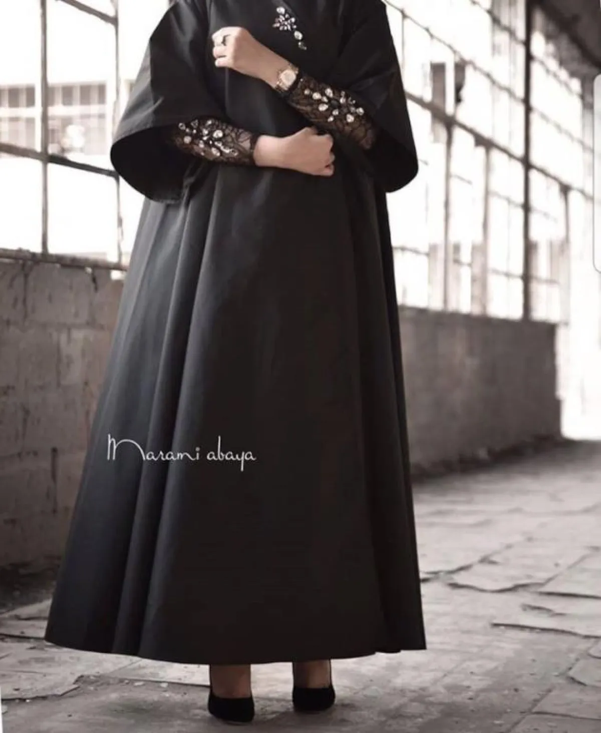 هذا الموديل من الساتان الحريري باللون الأسود، مع الأكمام الواسعة من Doth، سيناسب الكثير من الصبايا تحديدًا الممتلئات، فمع تطريزات الأكمام بالملاليم البيضاء، لن تبدي بوزن زائد، نسقيها مع حجاب باللون الأبيض، وتوب أو فستان أسود طويل.