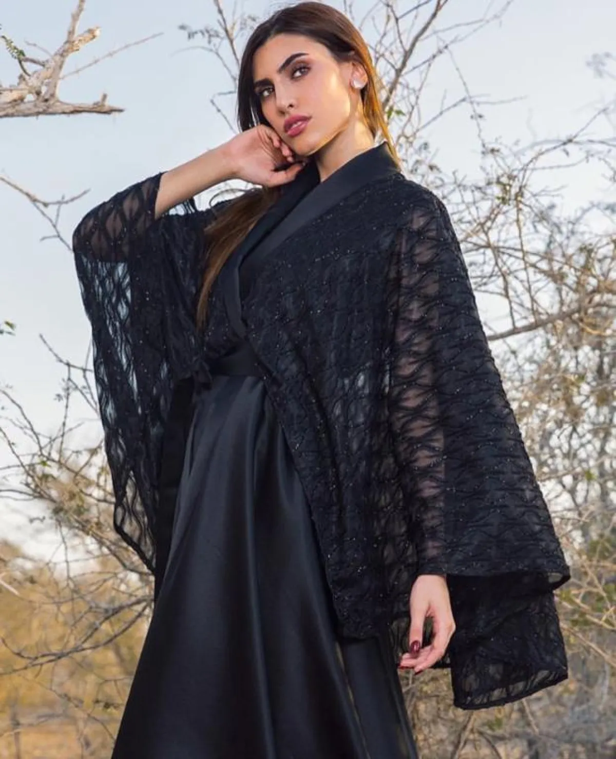 الأكمام المطرزة بالخرز الأسود على التول الشفاف، يضيف لكِ لمسة كلها أنوثة، كالعباية من ضحى النهاري Doha Al Nahary، لاطلالة بسيطة وهادئة لكنها مناسبة أكثر لأوقات بعد الظهر.