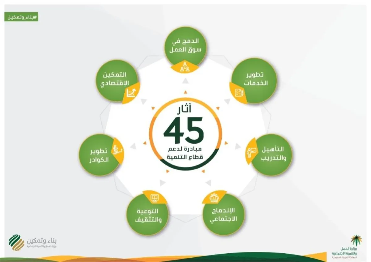 أعلنت وزارة العمل والتنمية الاجتماعية، عن إطلاق 45 مبادرة تنموية في مجالات مختلفة، تھدف إلى تعزیز مجال المبادرات الاجتماعية وتنمیة القطاعات غیر الربحیة المعنیة بتمكین المواطنین والمواطنات، وذلك من خلال برامج التمكین المختلفة وتطویر وتحسین فاعلیتھا وتأهيل قدرات القائمين عليها، عبر تعزيز الشراكات بین القطاعات الحكومیة والأھلیة لتحقیق التكامل الاجتماعي، تماشياً مع أهداف برنامج التحول الوطني ورؤية المملكة 2030.