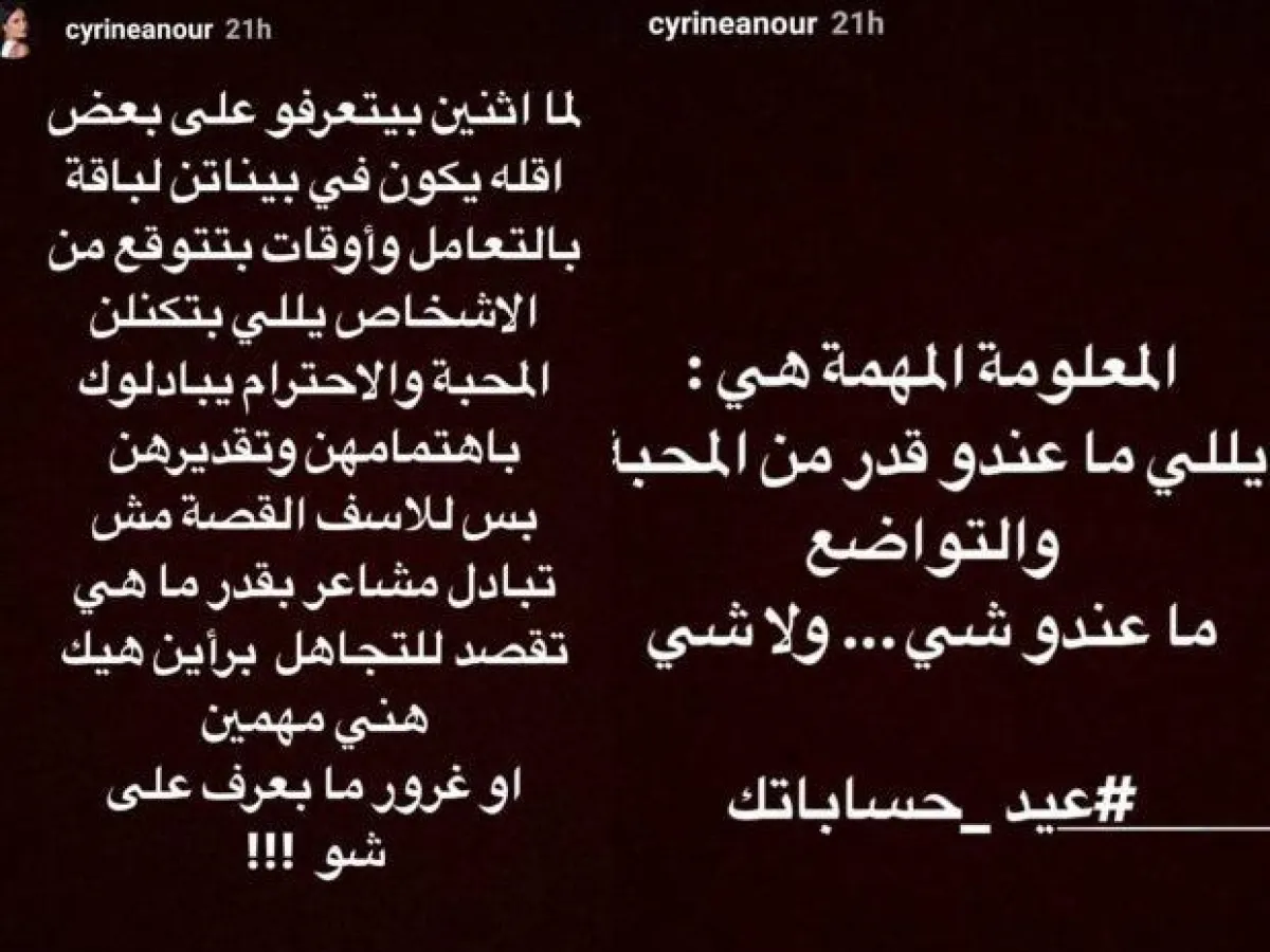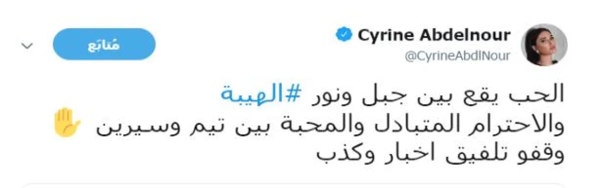 وقالت سيرين في تغريدة لها على موقع "تويتر": الحب يقع بين جبل ونور الهيبة.. والاحترام المتبادل والمحبة بين تيم وسيرين، وقّفوا تلفيق أخبار وكذب.