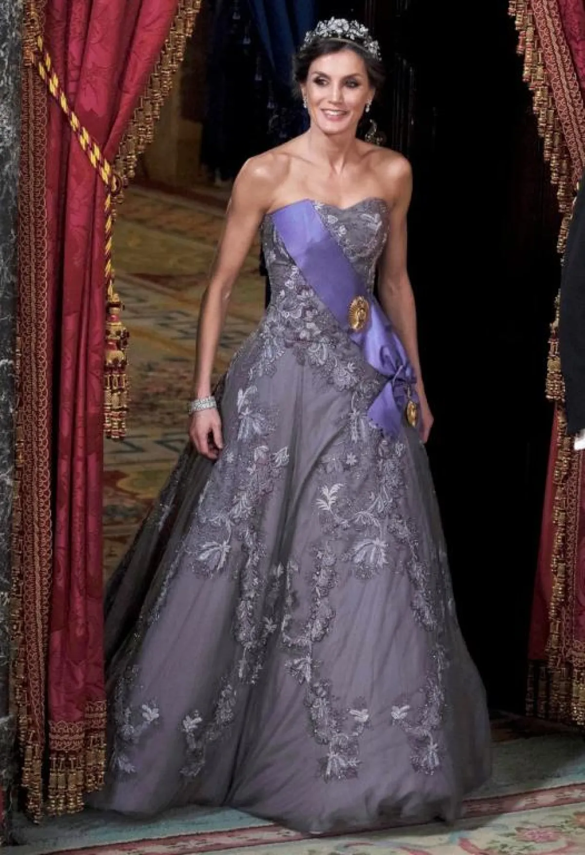 اختارت الملكة ليتيسيا Queen Letizia في إحدى المناسبات، فستان ماكسي بتصميم أنثوي ناعم من “نينا ريتشي” Nina Ricci باللون البنفسجي الفاتح، قماشه مزين بورود ناعمة من الكريستال، وقصته بسيطة مع أكمام قصيرة، وله حزام من الجلد على الخصر، نسقت معه صندلًا بكعب عالٍ باللون الذهبي المعدني.
