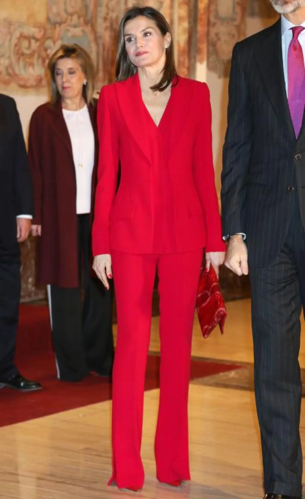 في إحدى المناسبات مؤخرًا، شاهدنا الملكة ليتيسيا Queen Letizia في لوك لافت وحيوي باللون الأحمر، اختارت فيه بدلة رسمية أنيقة من “كارولينا هيريرا” Carolina Herrera، عبارة عن بنطلون وبليزر، وقد نسقت معه حقيبة كلاتش من جلد الأفعى باللون الأحمر أيضًا، وبدت شبابية وأنيقة.