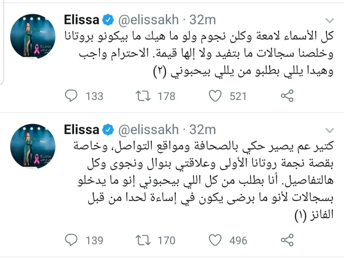 حاولت إليسا خلال اليومين الماضيين احتواء الأمر، من خلال تغريدة أعقبت قيامها بإلغاء متابعة نوال على "تويتر" جاء فيها "كتير عم يصير حكي بالصحافة ومواقع التواصل، وخاصة بقصة نجمة روتانا الأولى وعلاقتي بنوال ونجوى وكل هالتفاصيل. أنا بطلب من كل اللي بيحبوني إنو ما يدخلو بسجالات لأنو ما برضى يكون في إساءة لحدا من قبل الفانز".