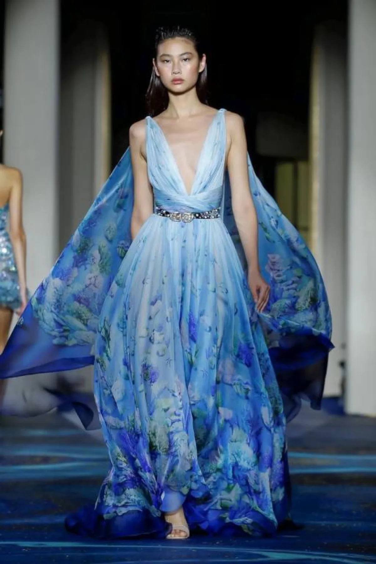 أيضاً أحببنا فستان  زهير مراد Zuhair Murad الأزرق المزين بالورود مع الوشاح الخلفي الطويل، وهو بقماش انسيابي ناعم.