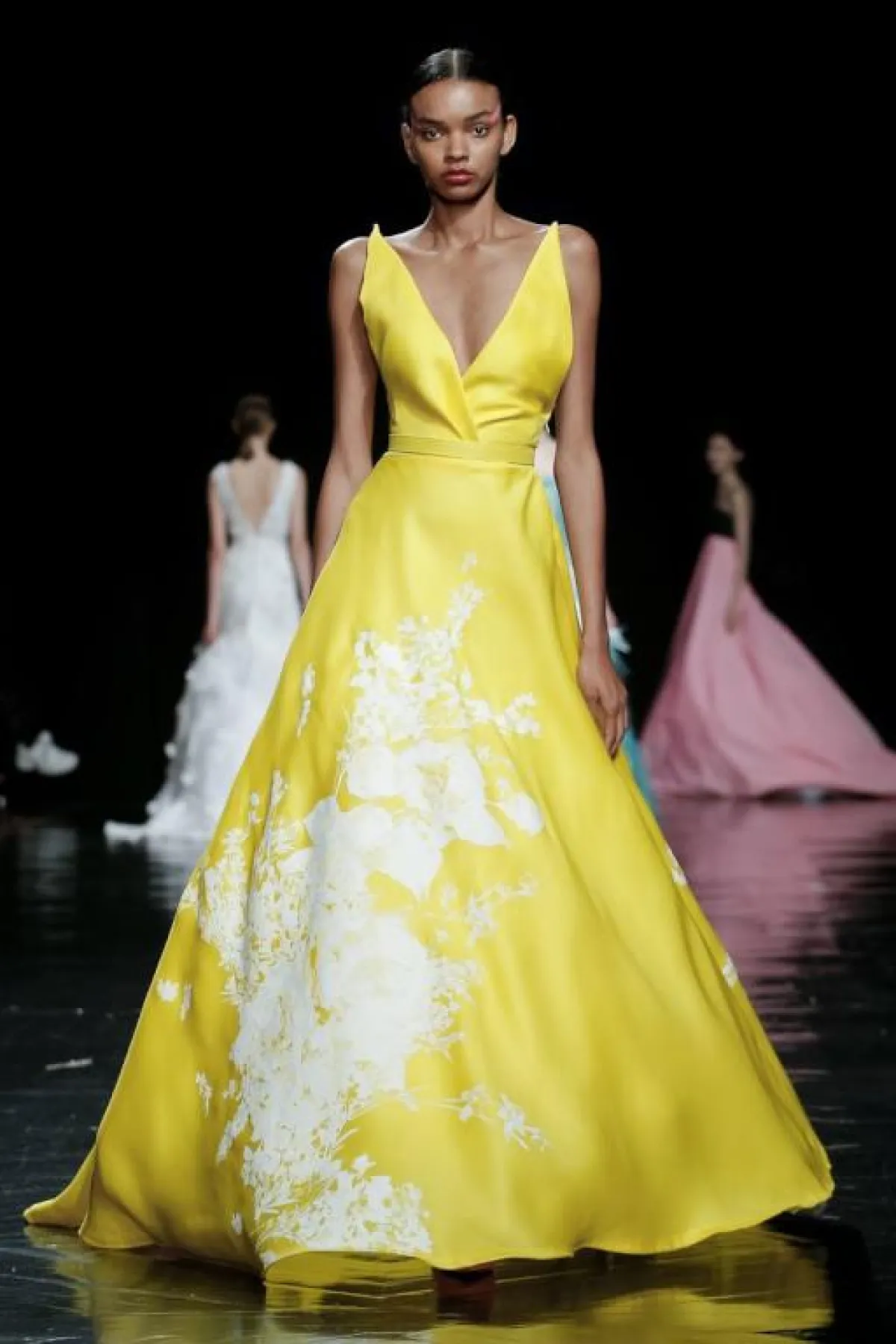 ومن ماركة Celia Kritharioti، إخترنا لكِ الفستان الأصفر، حيث أنه من أبرز ألوان الفساتين الرائجة لهذا العام، والمزين بالورود البيضاء على التنورة المنفوشة، ليناسب العروس التي تبحث عن فستان عصري ونابض بالحيوية.