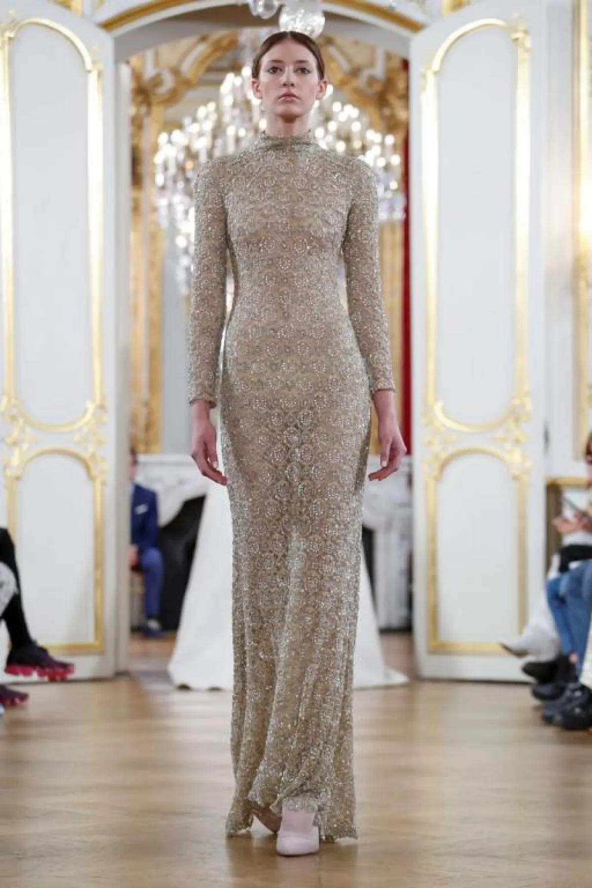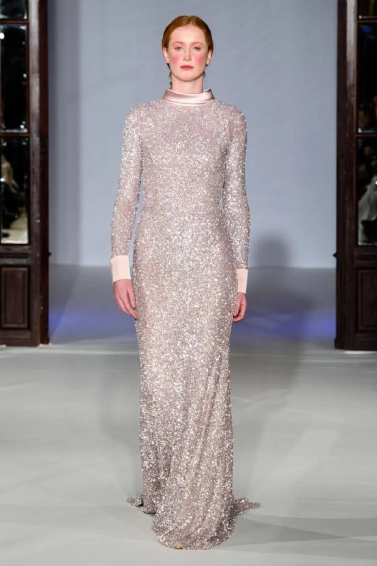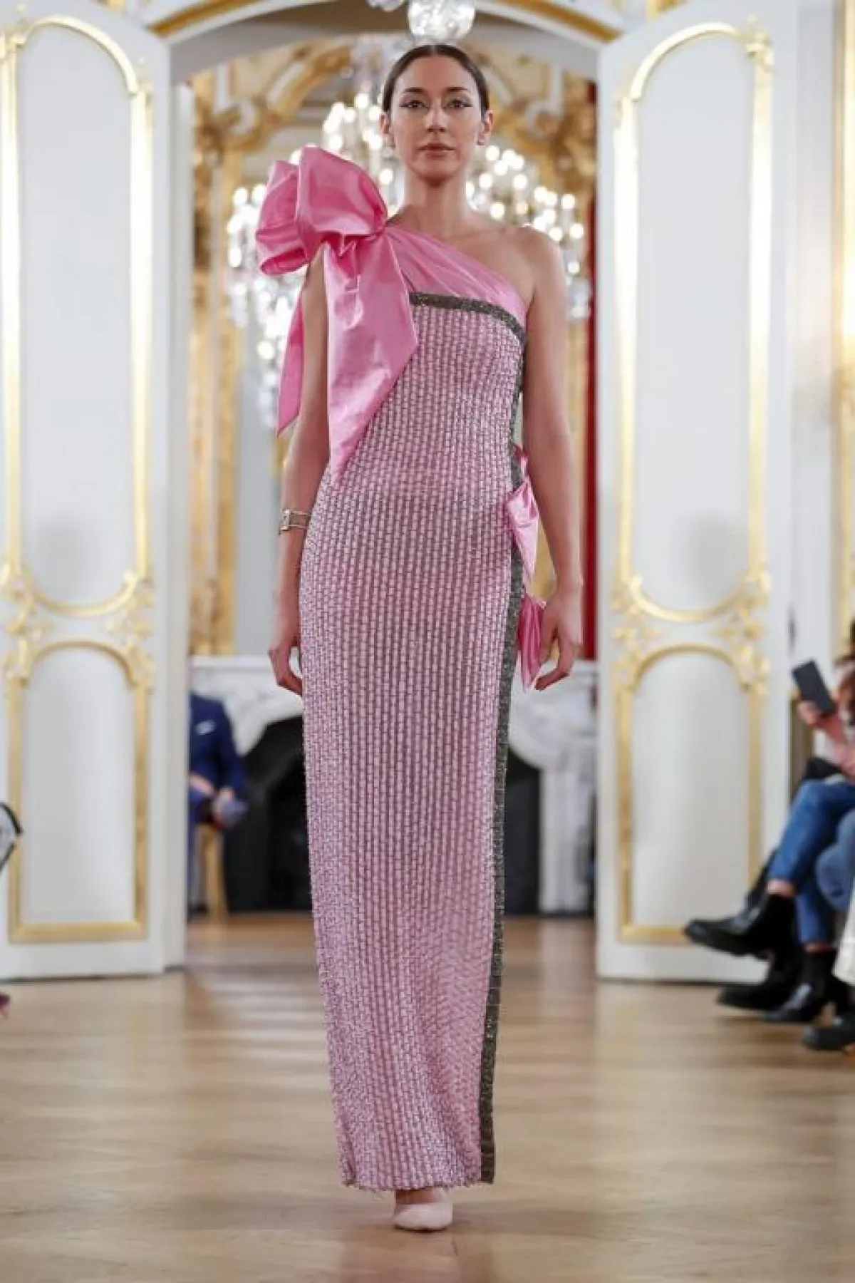 كما قدمت ماركة La Metamorphose فستان وردي بتصميم عمودي مغطى بالغليتر البرّاق، وتميز بالإحتشام حيث القبّة المرتفعة والأكمام الطويلة.