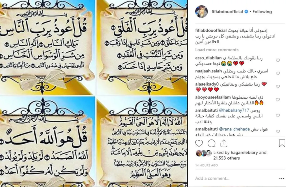 وبعد 10 ساعات فقط، فوجىء جمهور فيفي عبده بنشرها استغاثة عاجلة، حيث وضعت صورة مجمعة لسور التحصين من الحسد والسحر عبر حسابها بموقع إنستقرام، وعلقت عليها قائلة: إدعو لي أنا عيانة بموت ادعو لي ربنا يشفينى ويشفي كل مريض ‏يا رب العالمين آمين.