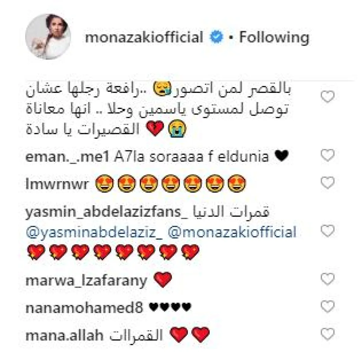 جمهور منى زكي لم ينشغل برسائلها، وإنما توقف أمام الطول الفارع لياسمين عبد العزيز وحلا شيحة، مقارنة بقصر القامة الواضح لمنى، وانتبه أغلبهم إلى أن الأخيرة حاولت الوقوف على أطراف أصابعها أثناء التصوير، لتصل هامتها إلى كتف ياسمين، وتقبلت منى التعليقات وردت ساخرة على أحد متابعيها: و الله تعبت من كتر ما بشب.