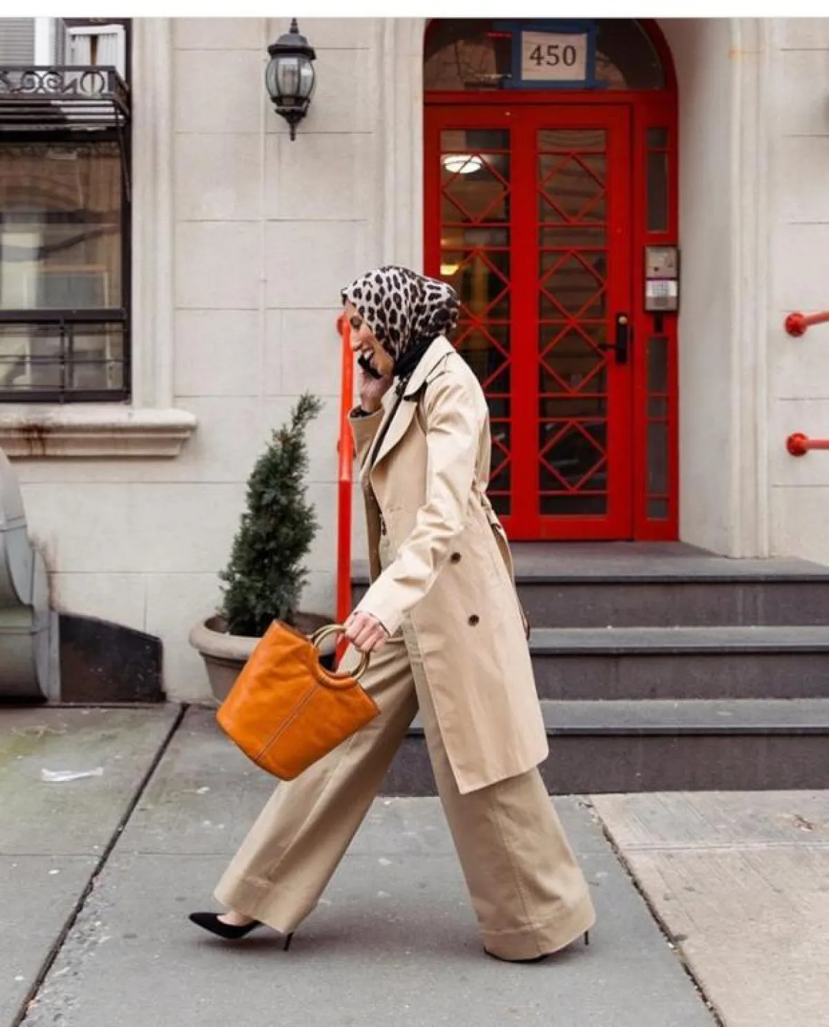 عادت هذه الموضة من جديد من أيام الثمانينيات، ننصحكِ بتطبيقها بطريقة حيادية، كهذا اللوك من ميلانيا الترك بالبنطلون البيج مع المعطف الترينش الطويل.