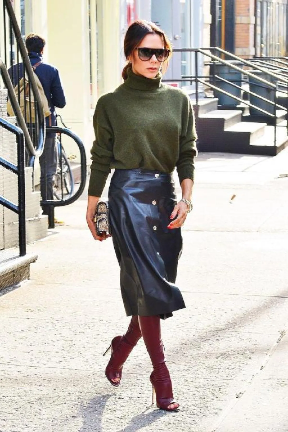 مصممة الأزياء الإنكليزية فيكتوريا بيكهام، هي واحدة من الشخصيات الملهمة في عالم الموضة، ليس فقط لأنها صاحبة دار أزياء راقية، بينما لأنها تتمتع بأسلوب فريد يميل إلى الاختيارات العملية، فهي ملهمة لأيّ امرأة تبحث عن اطلالات تناسب العمل. اخترنا من خزانتها تنورة ميدي من الجلد الأسود مع كنزة برقبة تناسب الطقس الحالي. انتعلت فيكتوريا بوت عنابيًّا بعنق طويل، ذهب باطلالتها إلى أقصى درجات الأناقة.