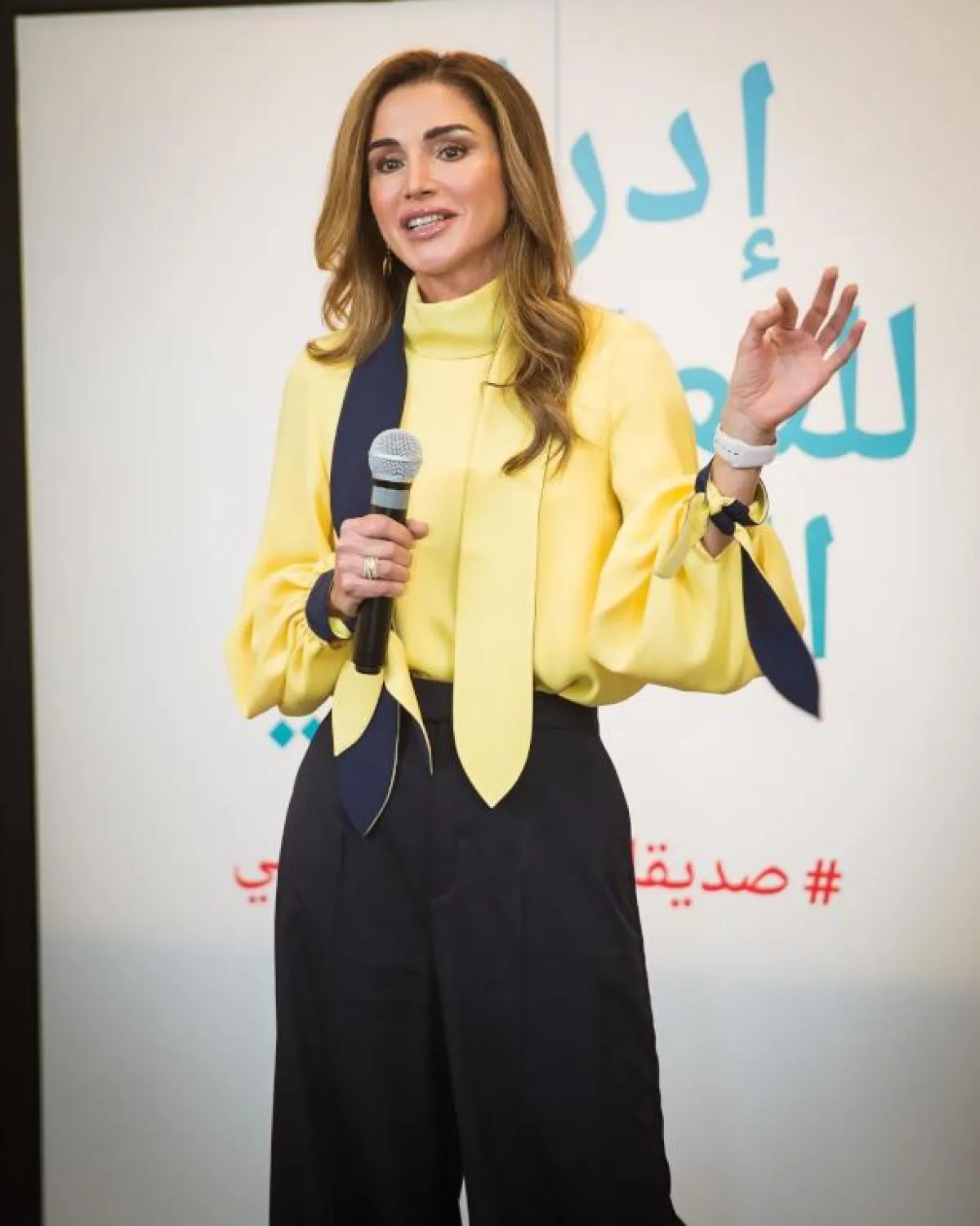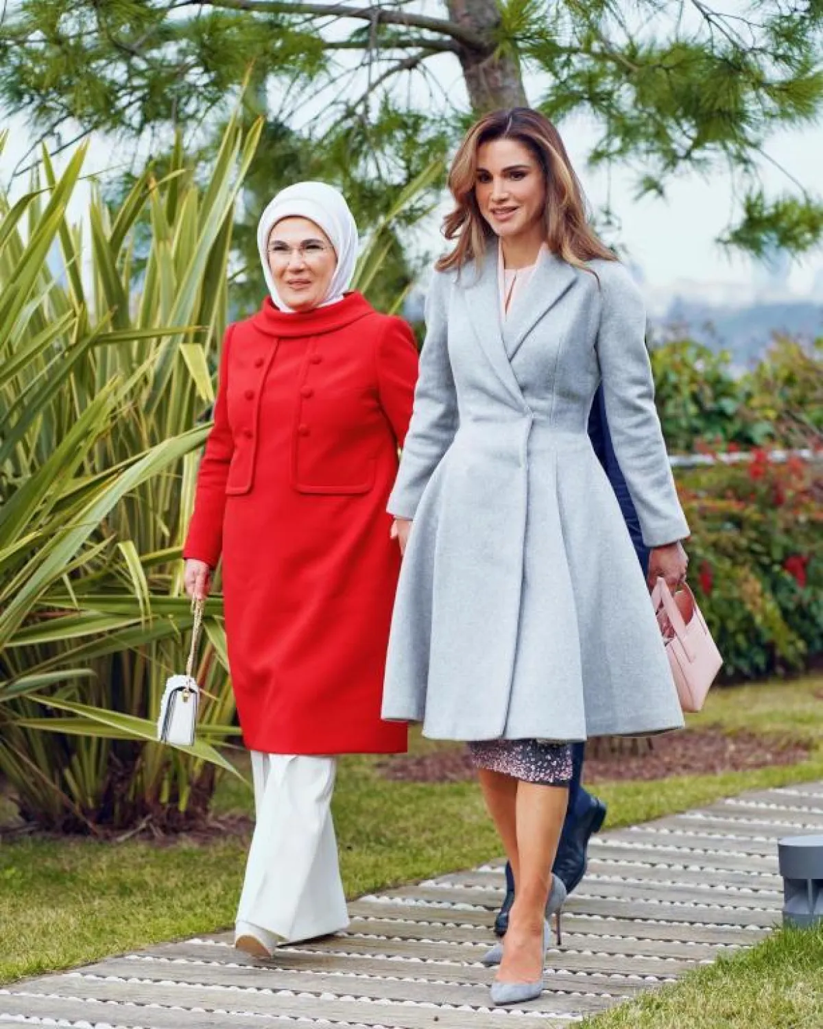 لاحظنا مع بداية هذا العام، أنّ الملكة رانيا ذهبت إلى ألوان تتصدر موضة 2019، ونجحت في أن تنسقها بأسلوب رسمي يناسب مكانتها. يتصدر اللون المرجاني موضة 2019، بخاصة بعد إعلان معهد بانتون المسؤول عن تحديد الألوان درجة المرجاني الحي، لتشكل اتجاهات الموضة، ويبدو أنّ هذا اللون المشع نال إعجاب الملكة رانيا، لذلك اعتمدت معطفًا بقصة مستقيمة مع كنزة باللون المرجاني المائل إلى ظل البرتقالي، ونسقته مع بنطلون أسود بساق مستقيم. نجح اللون المرجاني في أن يضيف بريقًا للون بشرتها، بخاصة وأنها طبقت مكياجًا بدرجات الخوخي.