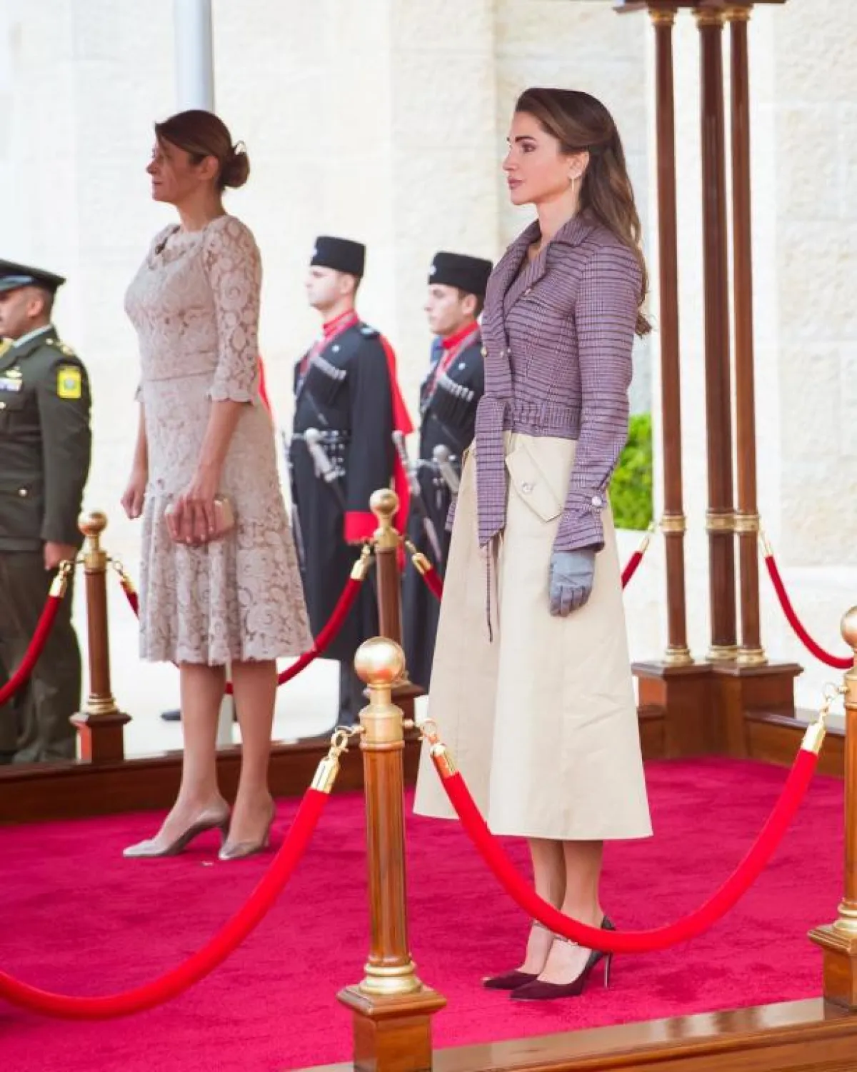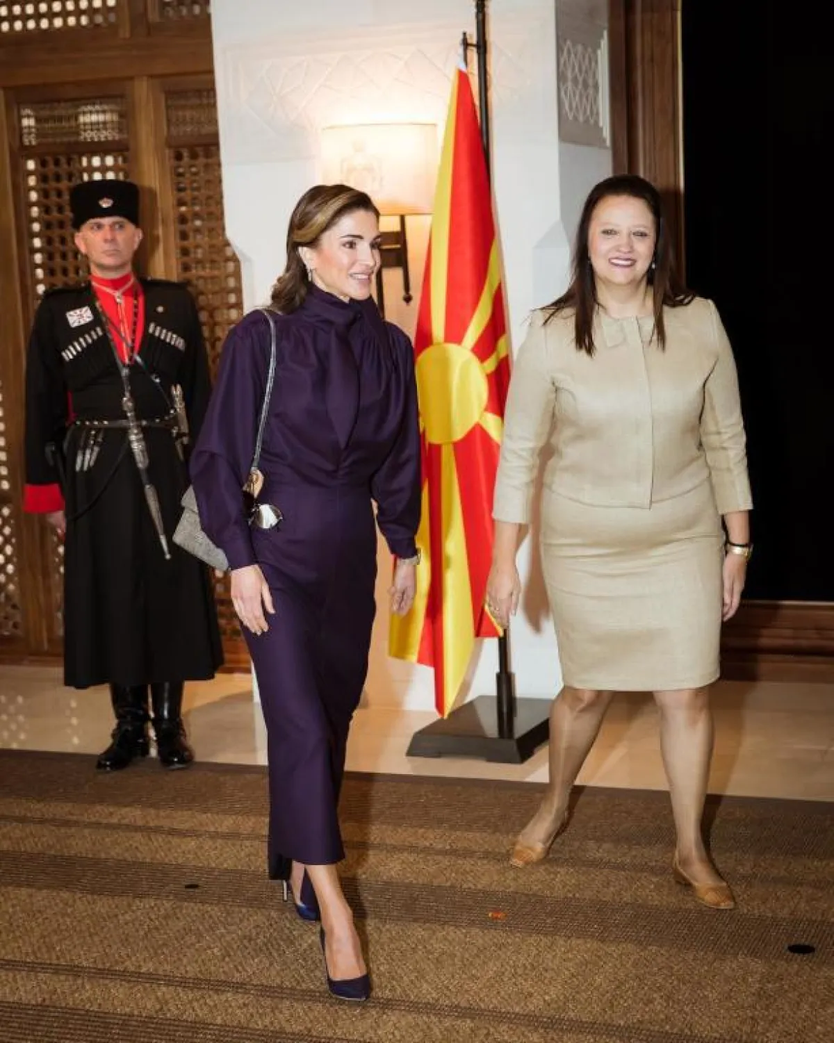 اختارت الملكة رانيا ظلين من البنفسجي، الأول هو الدرجة العميقة من خلال اطلالة مونوكروم، مكونة من فستان مستقيم بأكمام، ورباط يلف العنق مع زوج من أحذية الـ pump باللون ذاته.