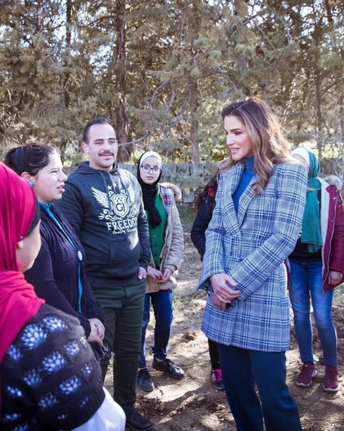 ثم اختارت الملكة رانيا ظلًّا متوسطًا من البنفسجي، حيث اعتمدت سترة تويد مع تنورة ميدي باللون البيج المتوسط.