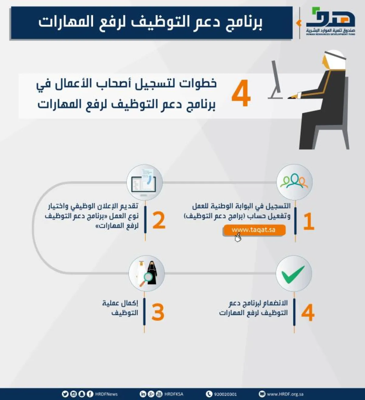أتاح صندوق تنمية الموارد البشرية (هدف)، للمنشآت أربعة خطوات ميسرة للتسجيل والاستفادة من برنامج دعم التوظيف لرفع المهارات، تبدأ بتسجيل المنشأة في البوابة الوطنية للعمل (طاقات) www.taqat.sa ، وتفعيل حساب "برامج دعم التوظيف" من قائمة برامجنا، ثم تقديم بيانات الإعلان الوظيفي بعد اختيار نوع العمل "برنامج دعم التوظيف لرفع المهارات" ورفعها على صفحة البوابة، ليتسنى للباحثين والباحثات عن عمل التقديم على الوظيفة، وفي الخطوة الرابعة بعد اكتمال مرحلة التوظيف، يتم انضمام المنشأة لبرنامج الدعم.