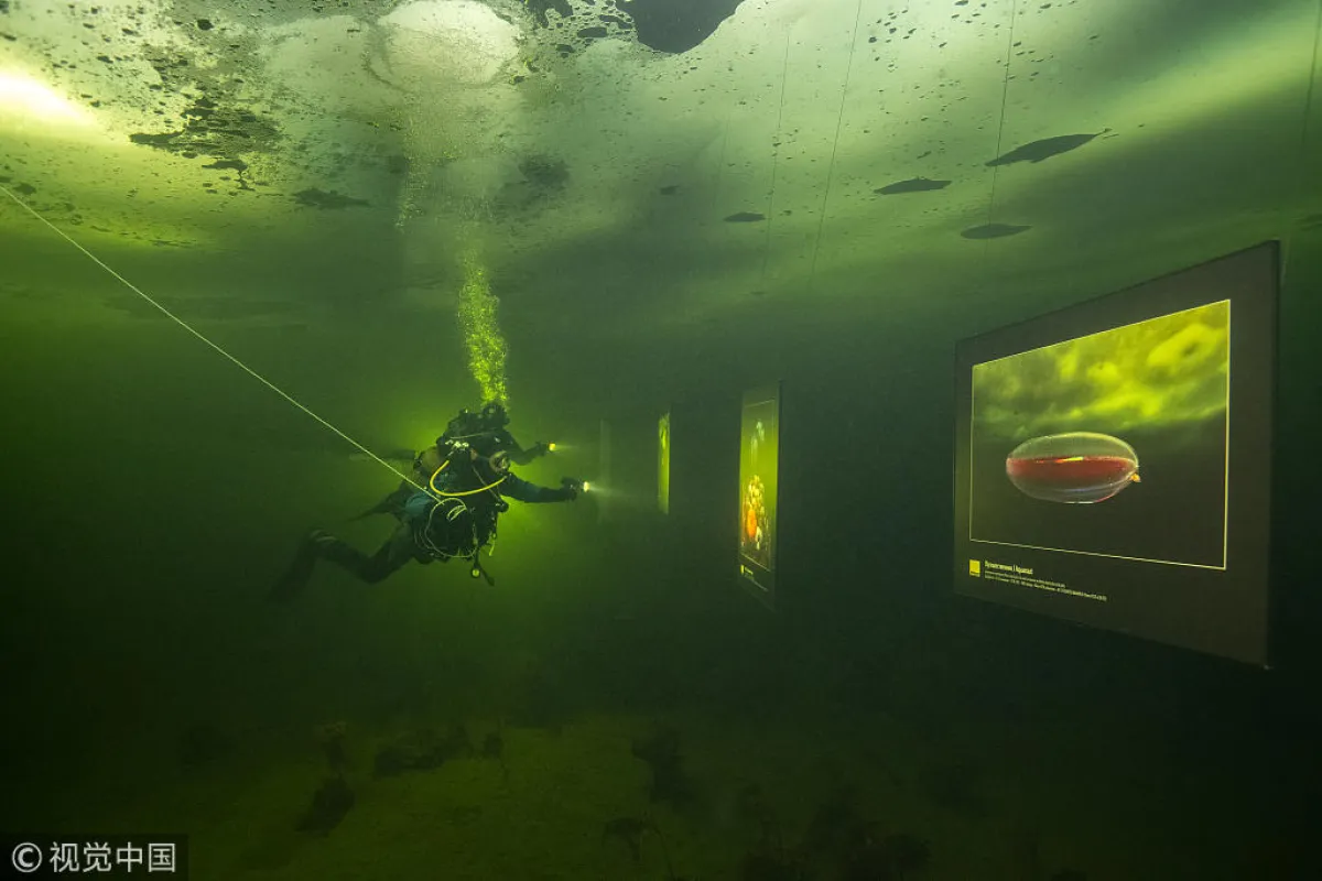 وبحسب موقع «تشاينا ديلي» أقام المصور الفوتوغرافي «فيكتور لياجوشكين» أول معرض فني تحت الجليد في العالم، حيث علق أعماله في نهر جليدي بالدائرة القطبية الشمالية في المياه التي تبلغ 2 درجة مئوية تحت الصفر، ويقوم الزائرون بالغوص في المياه الجليدية لمشاهدة الأعمال الفنية مرتدين بدلة الغوص وأنابيب الأكسجين للتنفس وكشافات الضوء لرؤية الأعمال، وخلال زيارة المعرض، اندهش أحد الزوار بوقوف سمكة أمام إحدى اللوحات التي تعرض صورة لسمكة أخرى، حيث تظهر السمكة وهي تراقب صورة لأحد أنواعها.