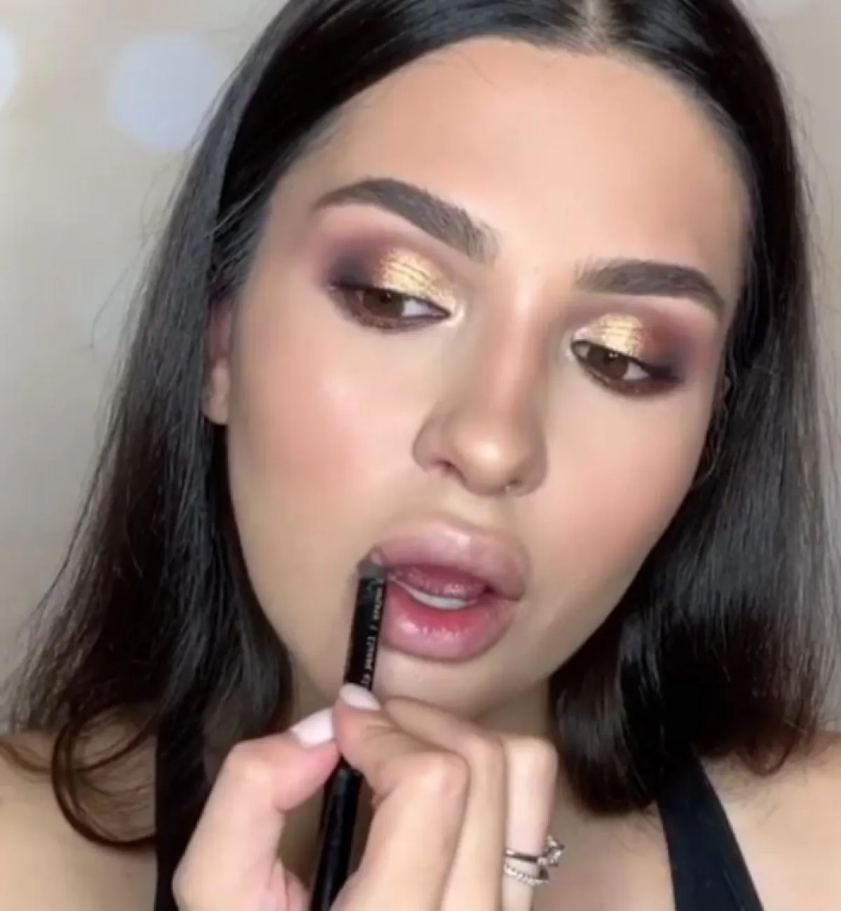 7- أمّا أحمر الشفاه جاء بدرجة من البنيّ الفاتح مع لمعة بسيطة.