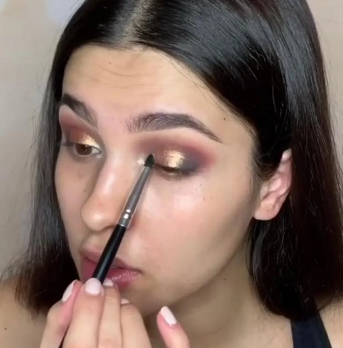 3- ثمّ يطبق اللّون النحاسيّ الذي يحتوي على حبيبات لامعة لإطلالة برّاقة وعيون بارزة بوضوح على ثنية العين المتحركة.