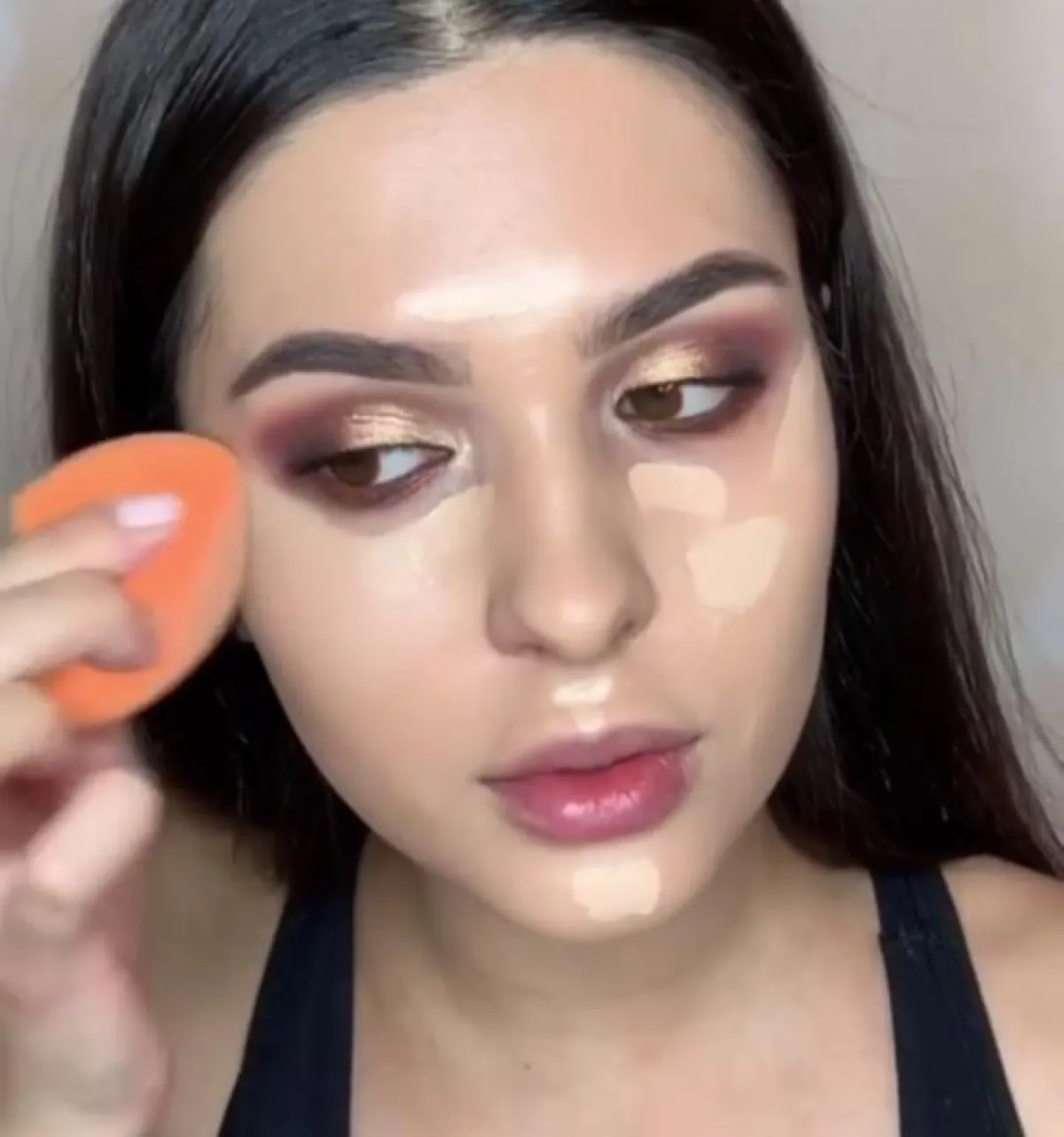 6- بعد الانتهاء من مكياج العيون، توضع حمرة الخدود باللّون الخوخيّ الداكن مع هايلايتر برونزيّ.