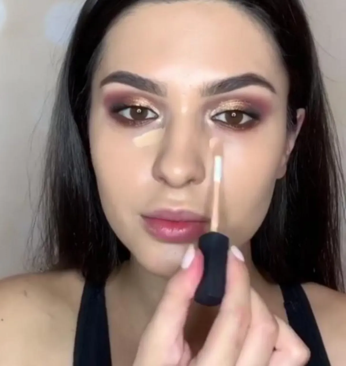 1- في الخطوة الأولى يضاف لونان من ظلال العيون الفاتح: الأوّل هو الكريمي الصريح مع البنيّ الفاتح، يطبّق الكريمي على الجفن، ثمّ البنيّ فوقه على شكل هلالفي الزاوية الخارجية للعين.