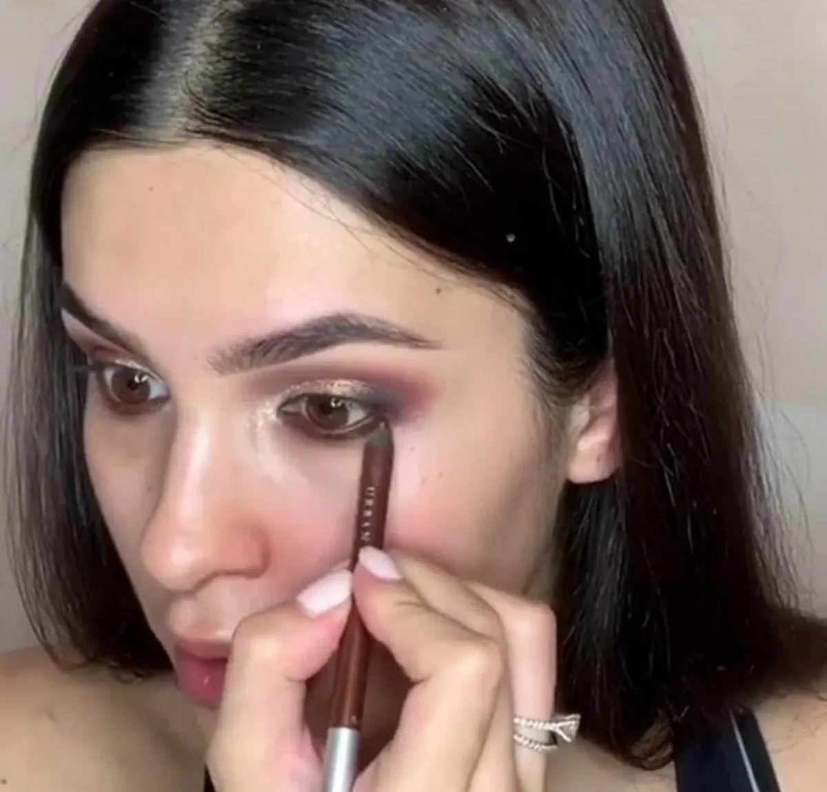 4- اختارت خبيرة المكياج تطبيق الكحل البني داخل العين مع رسم خطّ أسفل العين بظلال من لون الكاكاو لاستكمال الإطلالة وحماية الكحل من التسرّب.
