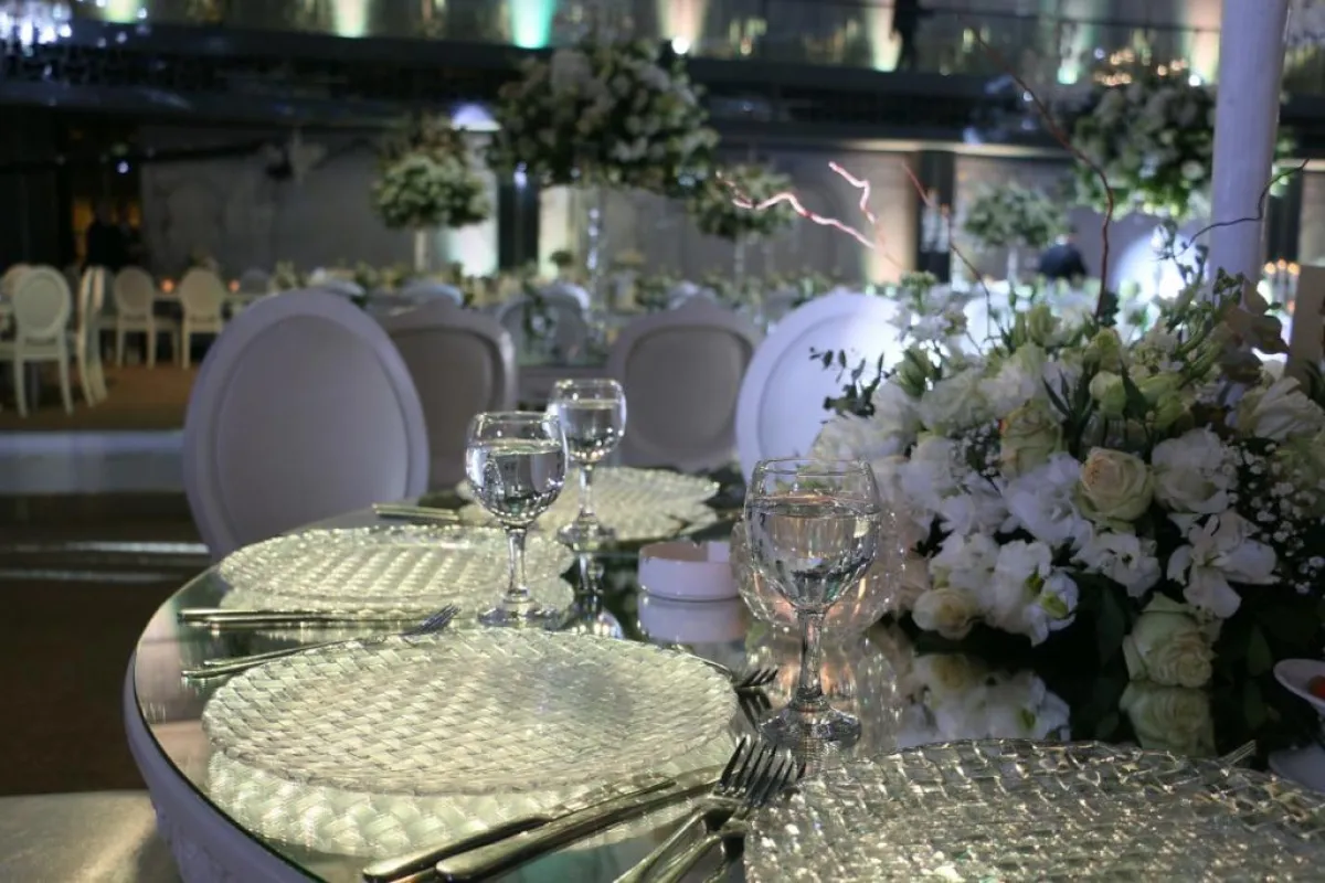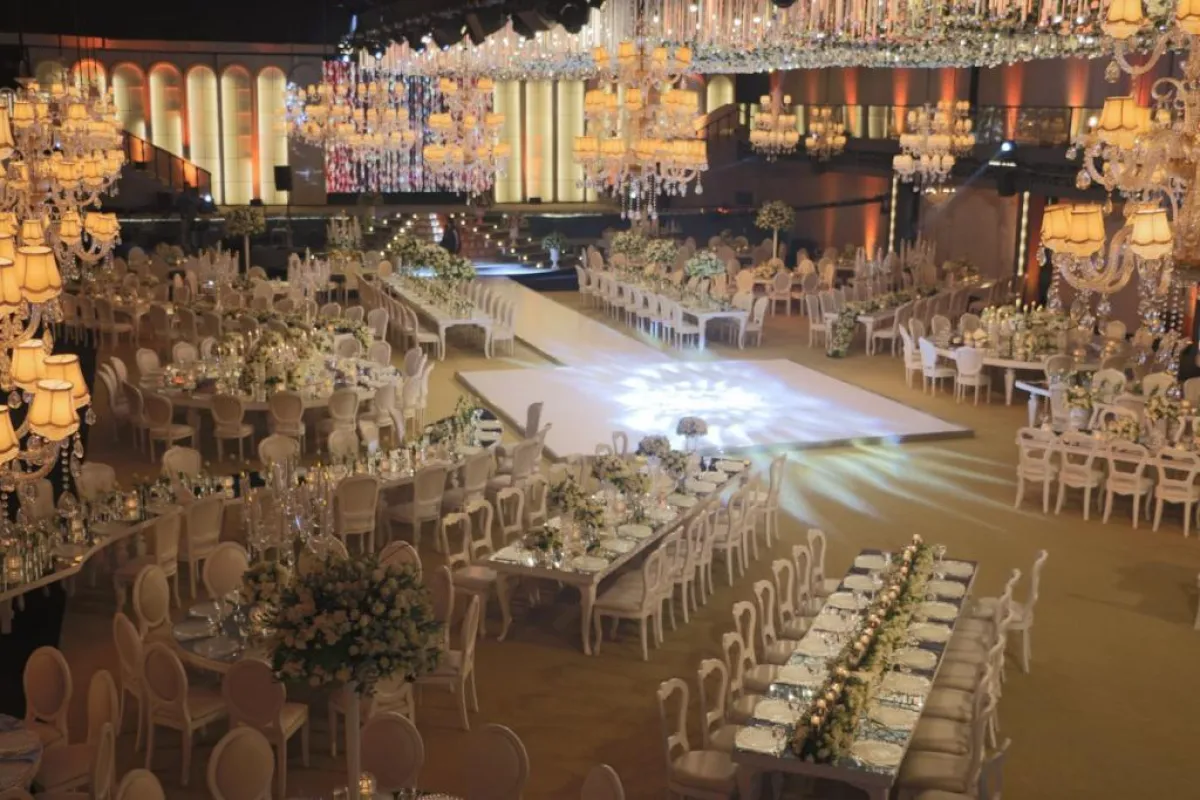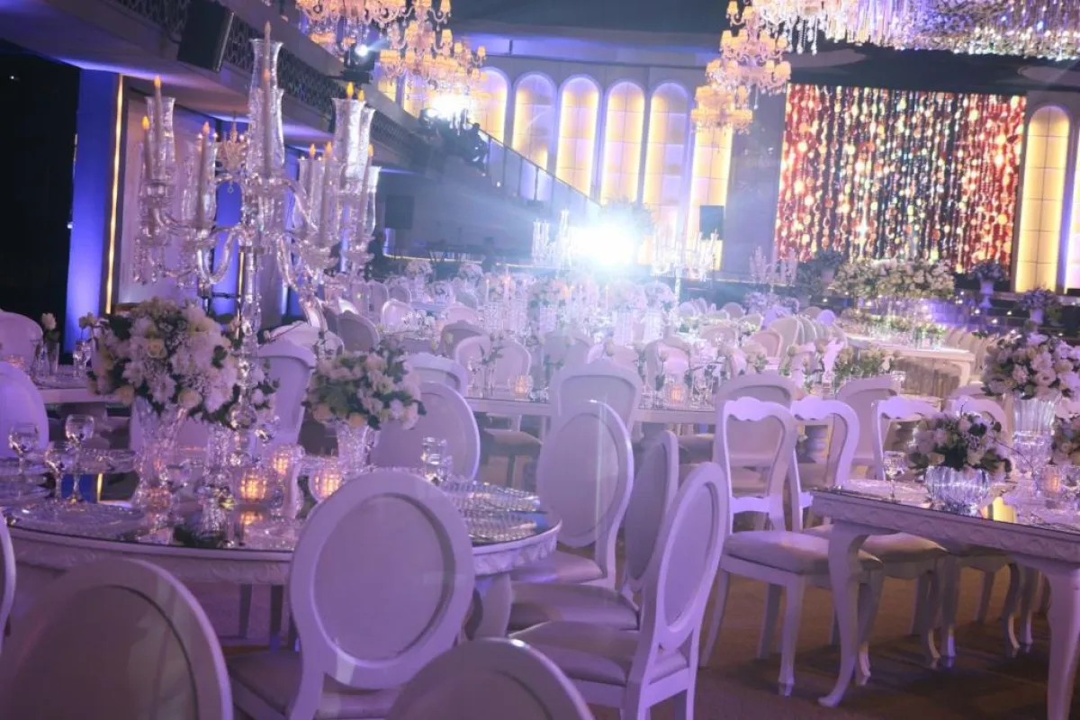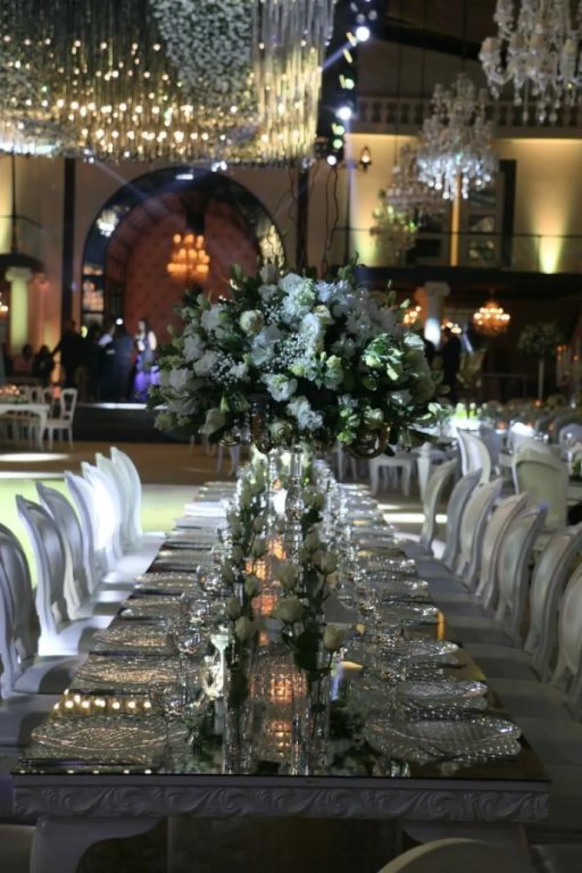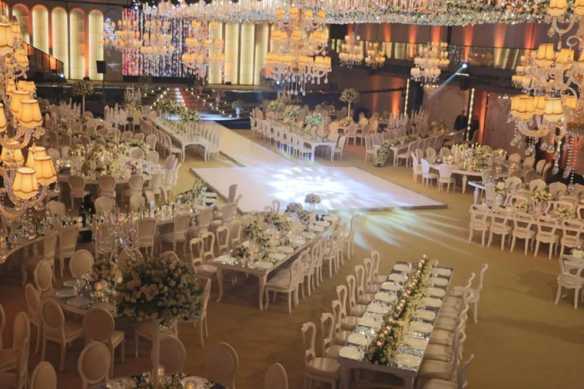 وعن ديكور الزفاف، فقد تميز باللونين الأبيض والذهبي، وزُيّنت الطاولات بالورود البيضاء، إضافة إلى الشموع التي تضفي جوًّا رومانسيًّا تحلم به كل عروس. أما الثريات الكريستالية فقد أضفت جمالًا على إضاءة الزفاف.