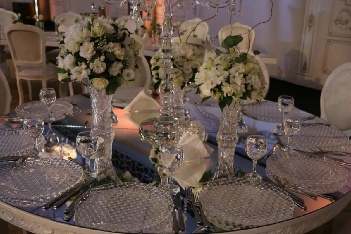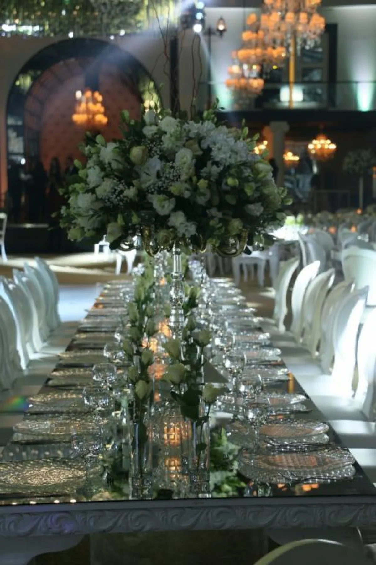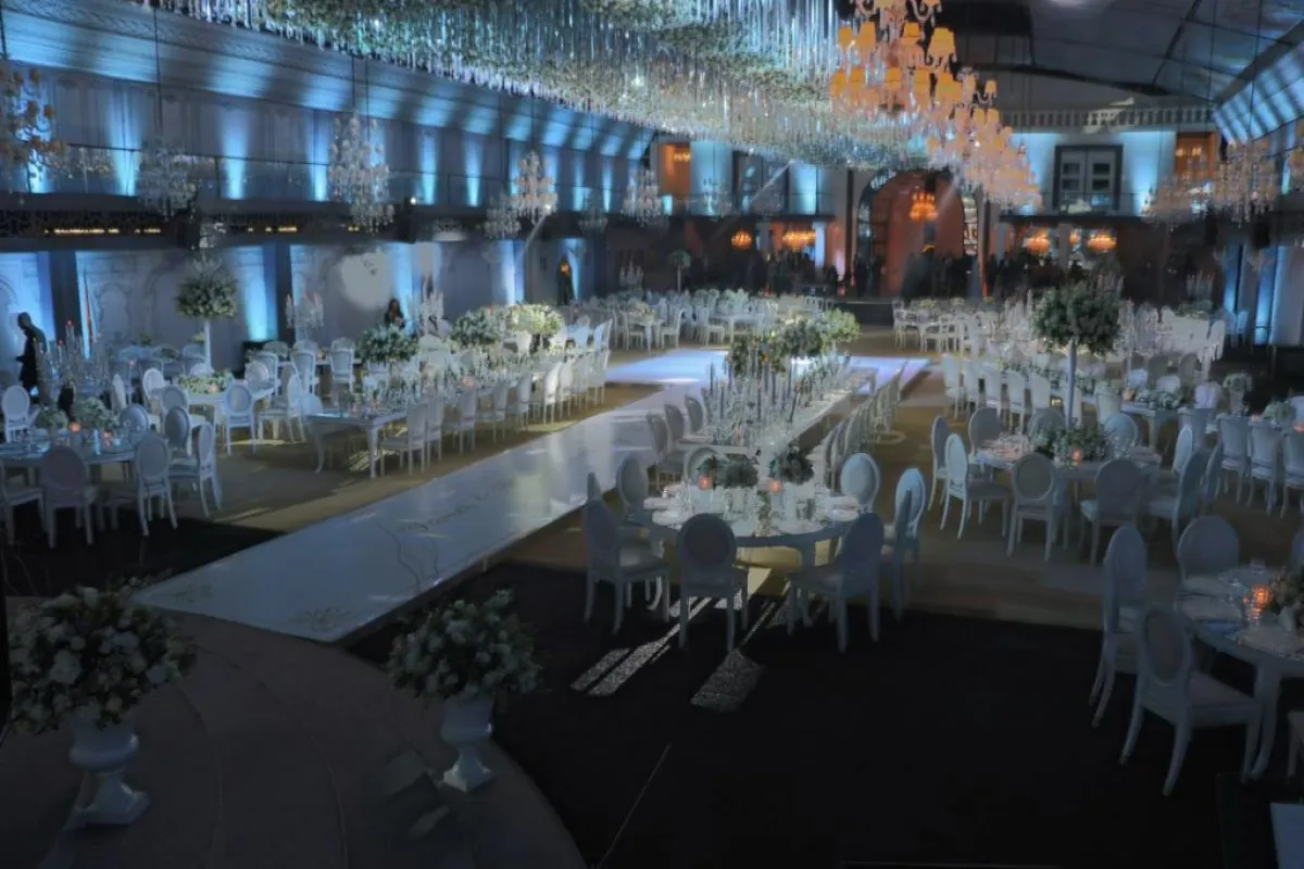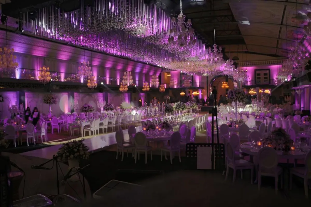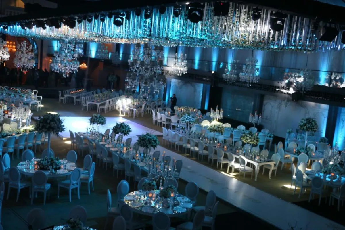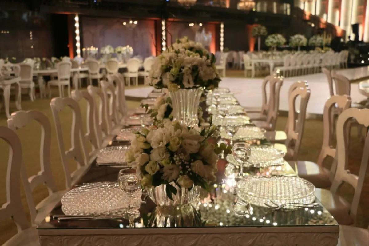 وعن ديكور الزفاف، فقد تميز باللونين الأبيض والذهبي، وزُيّنت الطاولات بالورود البيضاء، إضافة إلى الشموع التي تضفي جوًّا رومانسيًّا تحلم به كل عروس. أما الثريات الكريستالية فقد أضفت جمالًا على إضاءة الزفاف.