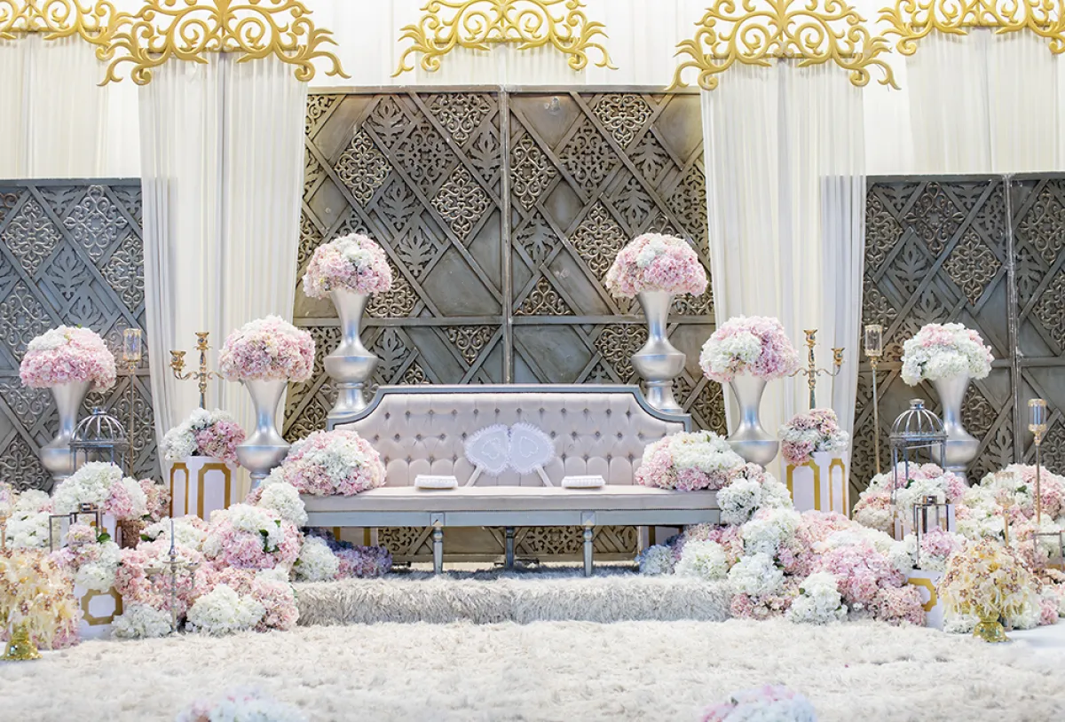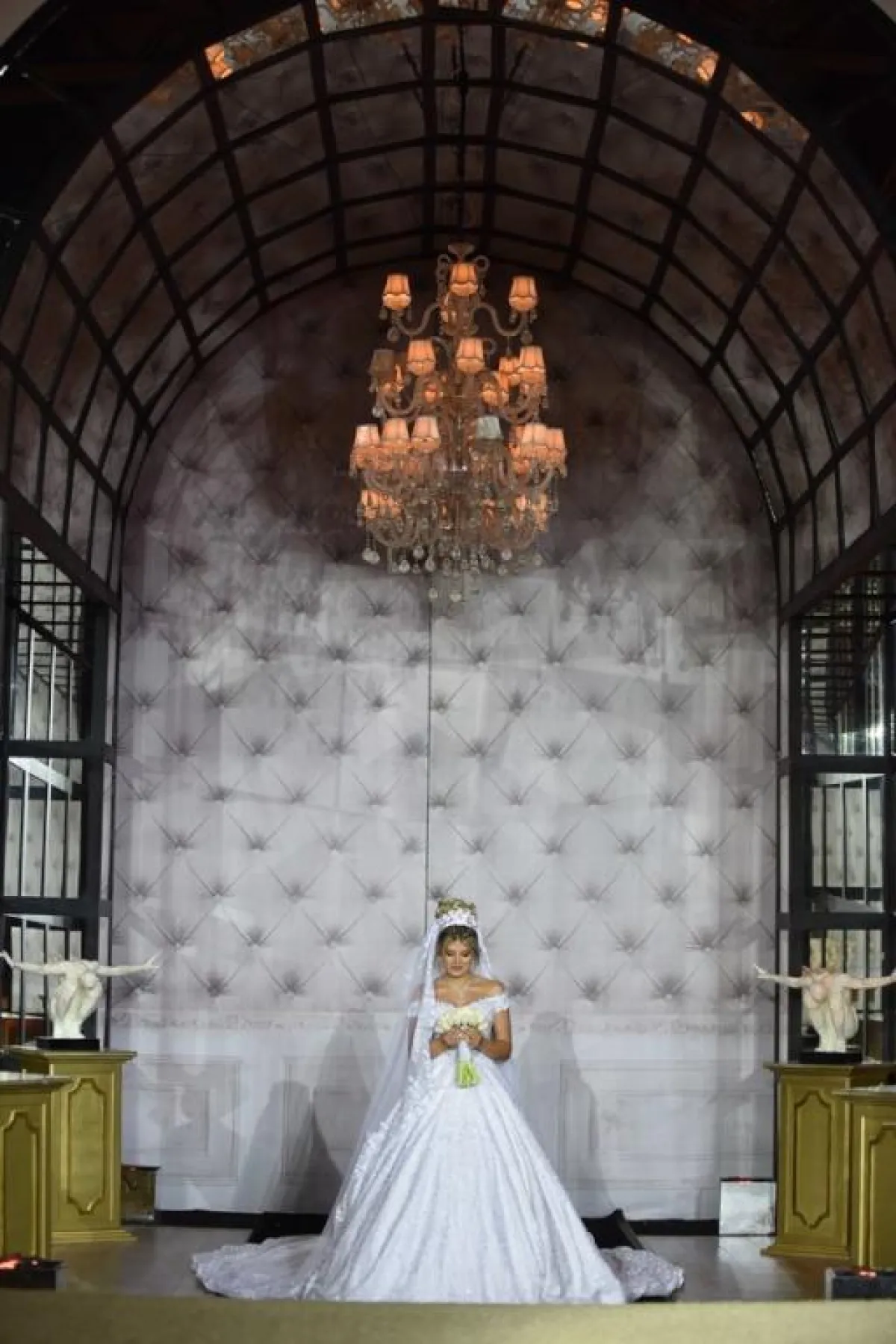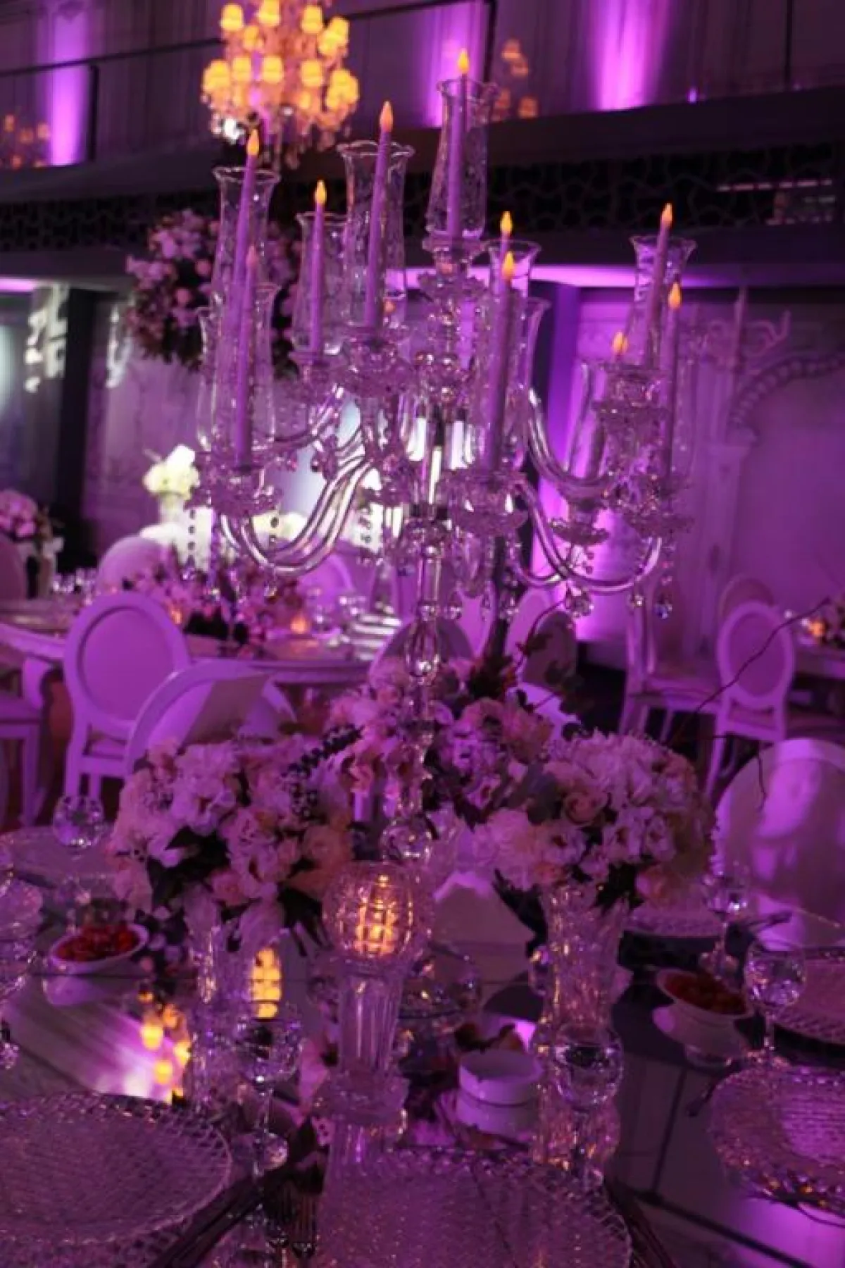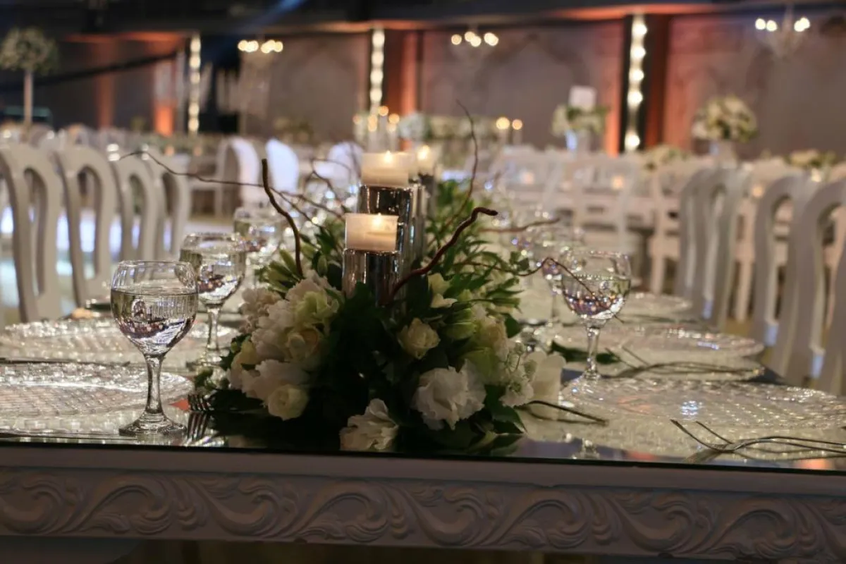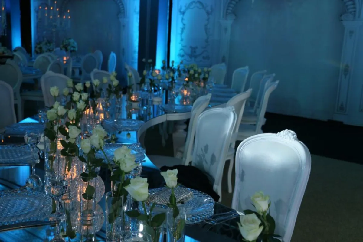 وعن ديكور الزفاف، فقد تميز باللونين الأبيض والذهبي، وزُيّنت الطاولات بالورود البيضاء، إضافة إلى الشموع التي تضفي جوًّا رومانسيًّا تحلم به كل عروس. أما الثريات الكريستالية فقد أضفت جمالًا على إضاءة الزفاف.
