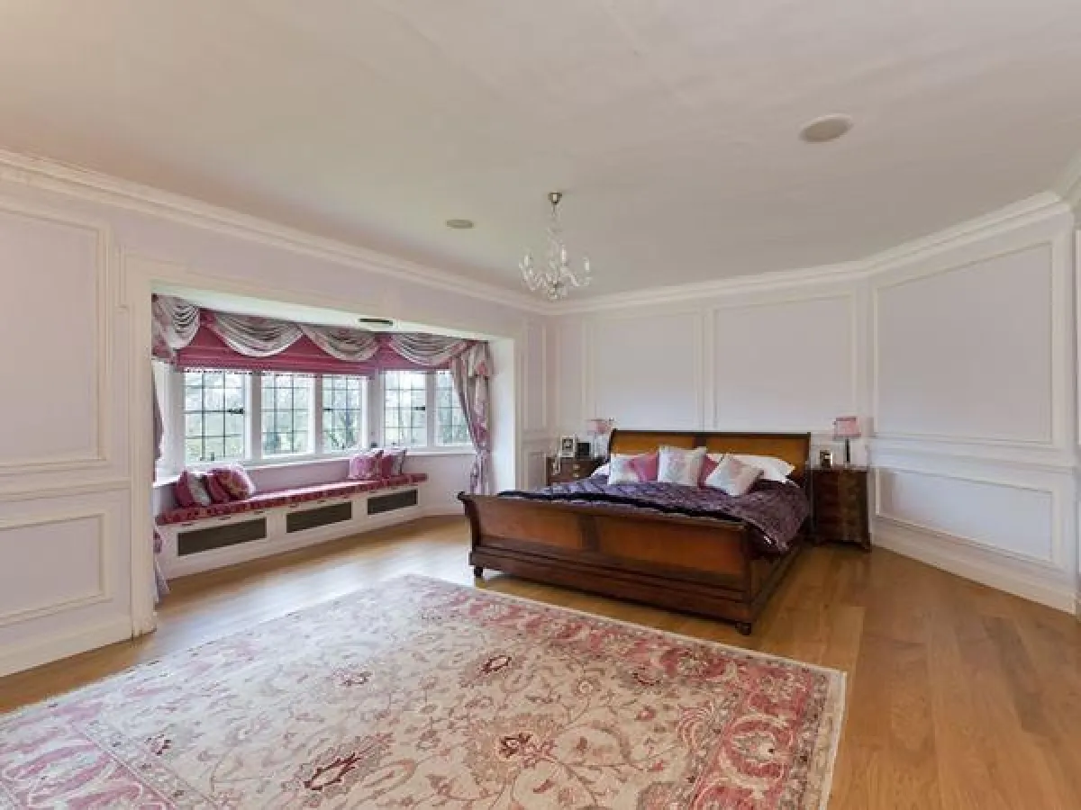 في القصر الذي استأجرته النجمة العالميَّة أديل سابقًا بمنطقة "هوف" الألمانيَّة، يمدُّ الطراز الكلاسيكي بساطه في غرفة النوم الرئيسة، التي يتصدَّرها سرير خشب، وتتقدَّمه سجادة "أنتيك" محاكة بخيوط ورديَّة تُطعِّم المساحة بلمسة أنثويَّة هادئة. وفي أسفل النافذة، تطلُّ الجلسة على المساحة الخارجيَّة.