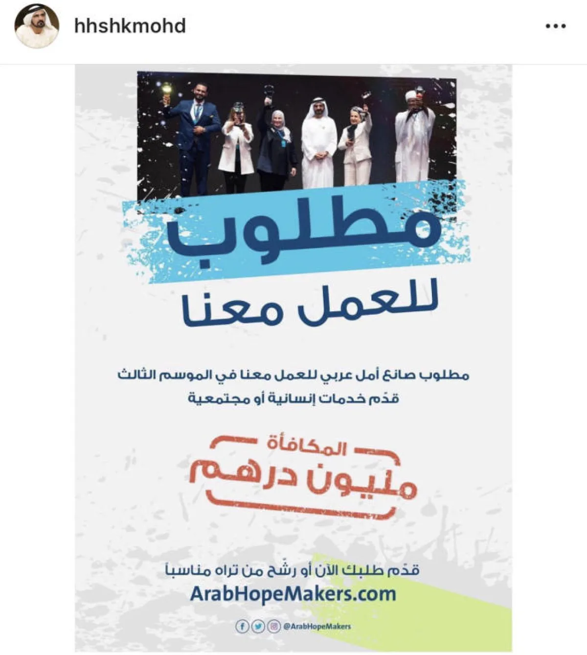 ودعا الشيخ محمد بن راشد آل مكتوم، كل من يهتم بصناعة الأمل في عالمنا العربي والمحبة ومساعدة الناس وأسعاد الآخرين، ويستطيع أن يغير حياة ولو إنسان على المستوى التعليمي أو الصحى أو الإنساني أو الثقافي أو حتى البيئي أن يتقدم لتلك الوظيفة ليكون قدوة لمجتمعاتنا ونرى من خلاله أملاً جديداً في الحياة.