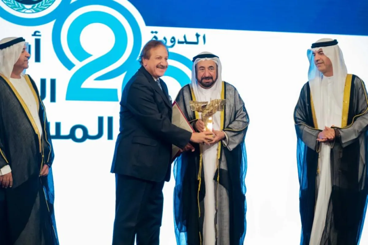 وكرم حاكم الشارقة الفنان الكويتي القدير محمد المنصور بمناسبة فوزه بجائزة الشارقة للإبداع المسرحي العربي، والفنان الإماراتي حبيب غلوم بجائزة الشخصية المحلية المكرمة.