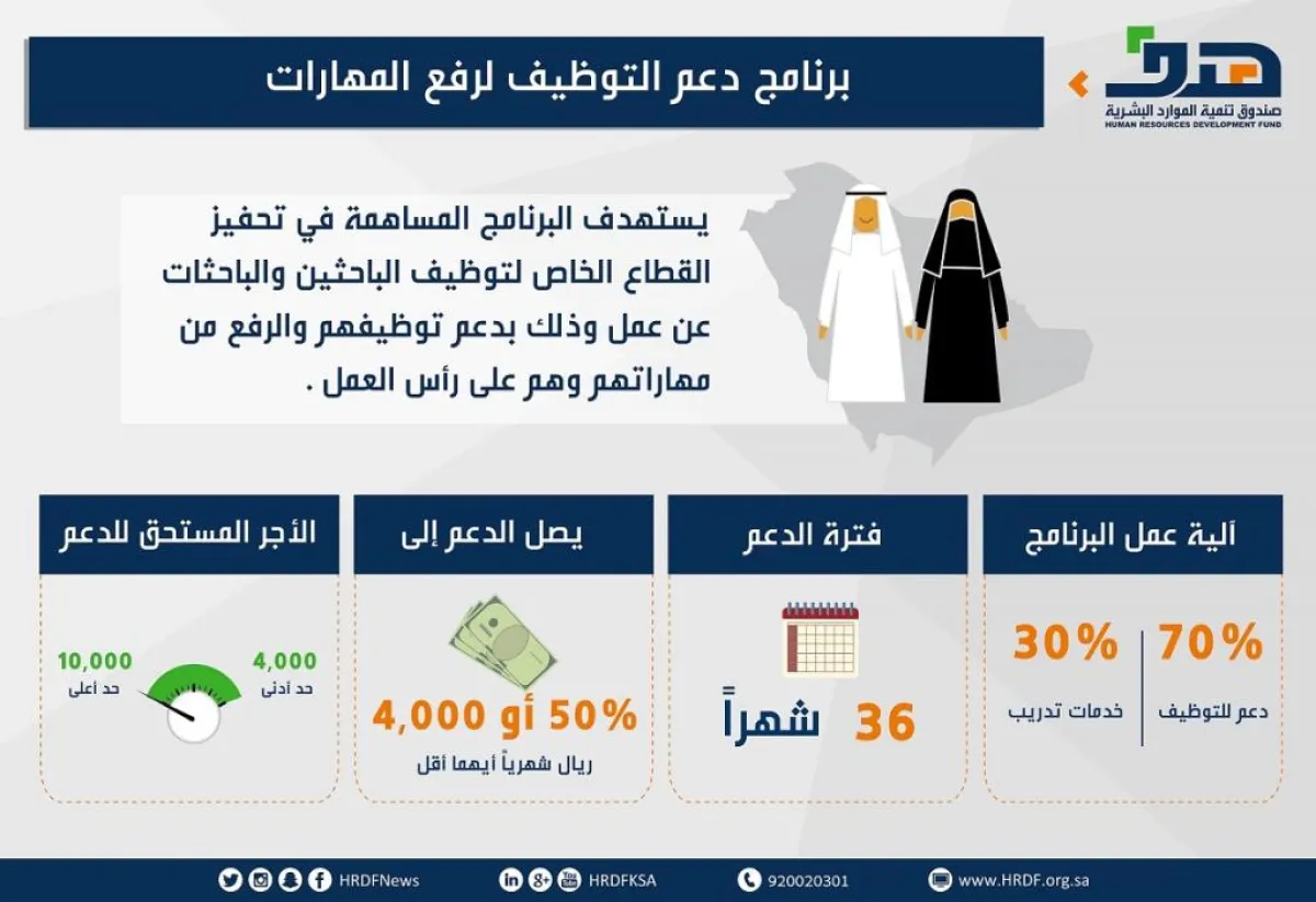 وأقرت آلية عمل برنامج دعم التوظيف لرفع المهارات، بتوجيه 70 % من دعم البرنامج للتوظيف و30 % لدعم التدريب، بهدف الاستثمار في رأس المال البشري، فيما تمتد فترة الدعم المالي لراتب الموظف المدعوم عن طريق البرنامج، إلى 36 شهرًا، بمعدل 30 % من الراتب الشهري للسنة الأولى من الدعم، و20% للسنة الثانية، و10 % للسنة الثالثة، كما تضاف نسبة إضافية للدعم، عند توظيف المنشأة للإناث أو الأشخاص ذوي الإعاقة، وعند التوظيف في المدن الصغيرة والقرى، وفي حال كان حجم المنشأة 50 عامل فأقل.