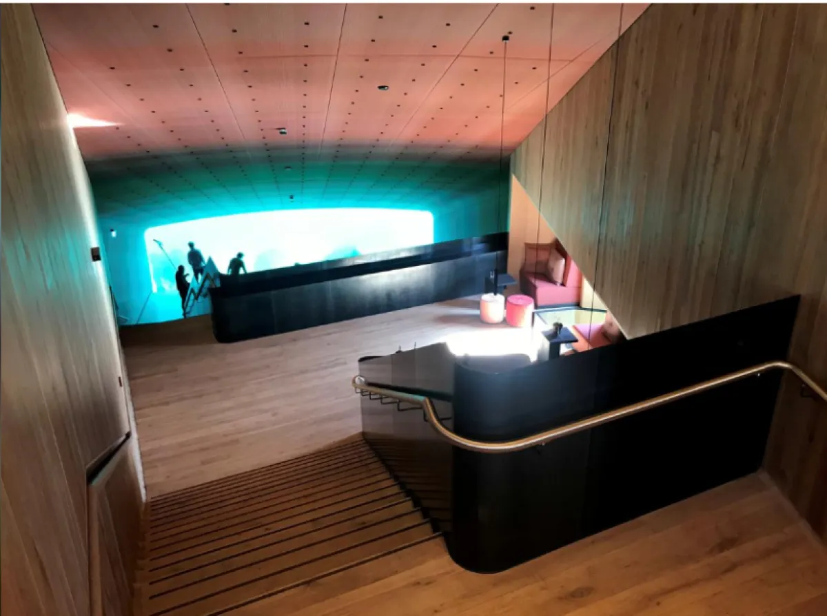 وتم تصميم المطعم بحيث يضم حائطاً من الزجاج في الجزء المغمور بالمياه من أجل الحصول على إطلالة فريدة ومشاهدة الأسماك أثناء تناول الطعام.