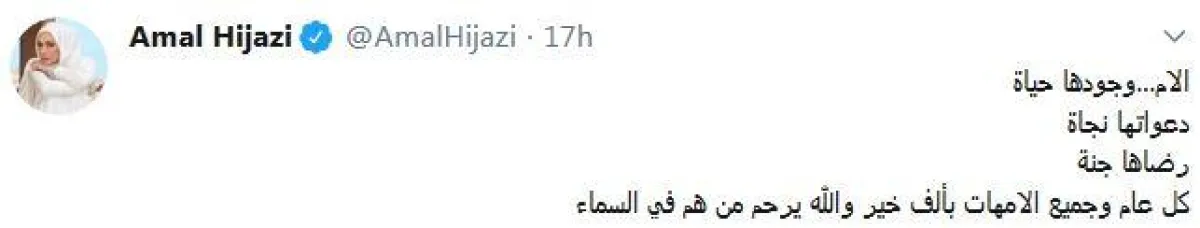 أما أمل حجازي التي أطلقت أغنية "بكرا بيكبروا" بمناسبة يوم الأم فكتبت "الأم...وجودها حياة دعواتها نجاة رضاها جنة كل عام وجميع الامهات بألف خير والله يرحم من هم في السماء".
