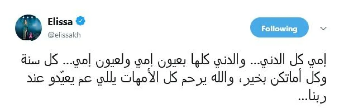 وعايدت إليسا أمها وكل الأمهات وكتبت "إمي كل الدني... والدني كلها بعيون إمي ولعيون إمي... كل سنة وكل أماتكن بخير، والله يرحم كل الأمهات يللي عم يعيّدو عند ربنا...".