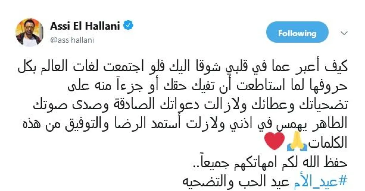 أما الفنان عاصي الحلاني فتذكّر والدته الراحلة وكتب: "كيف أعبّر عمّا في قلبي شوقا اليك فلو اجتمعت لغات العالم بكل حروفها لما استاطعت أن تفيك حقك أو جزء منه على تضحياتك وعطائك ولا زالت دعواتك الصادقة وصدى صوتك الطاهر يهمس في اذني ولازلت أستمد الرضا والتوفيق من هذه الكلمات حفظ الله لكم امهاتكهم جميعاً.. عيد الأم عيد الحب والتضحية"