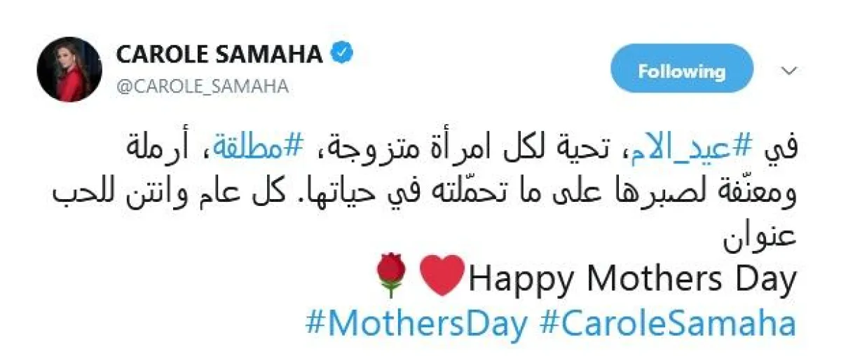 كارول سماحة اختارت المناسبة لتوجّه تحيّة إلى الأمهات المعنّفات فكتبت: "في عيد الام، تحیة لكل امرأة متزوجة، مطلقة، أرملة ومعنّفة لصبرھا على ما تحمّلته في حیاتھا. كل عام وانتن للحب عنوان ".