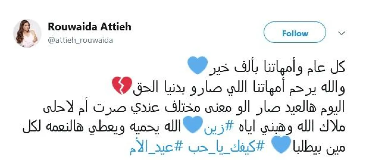 وكتبت رويدا عطيّة التي تحتفل بعيد الأم في أوّل سنة أمومة بعد ولادة ابنها زين "كل عام وأمهاتنا بألف خير والله يرحم أمهاتنا اللي صارو بدنيا الحق اليوم هالعيد صار الو معنى مختلف عندي صرت أم لاحلى ملاك الله وهبني اياه زين الله يحميه ويعطي هالنعمه لكل مين بيطلبا".