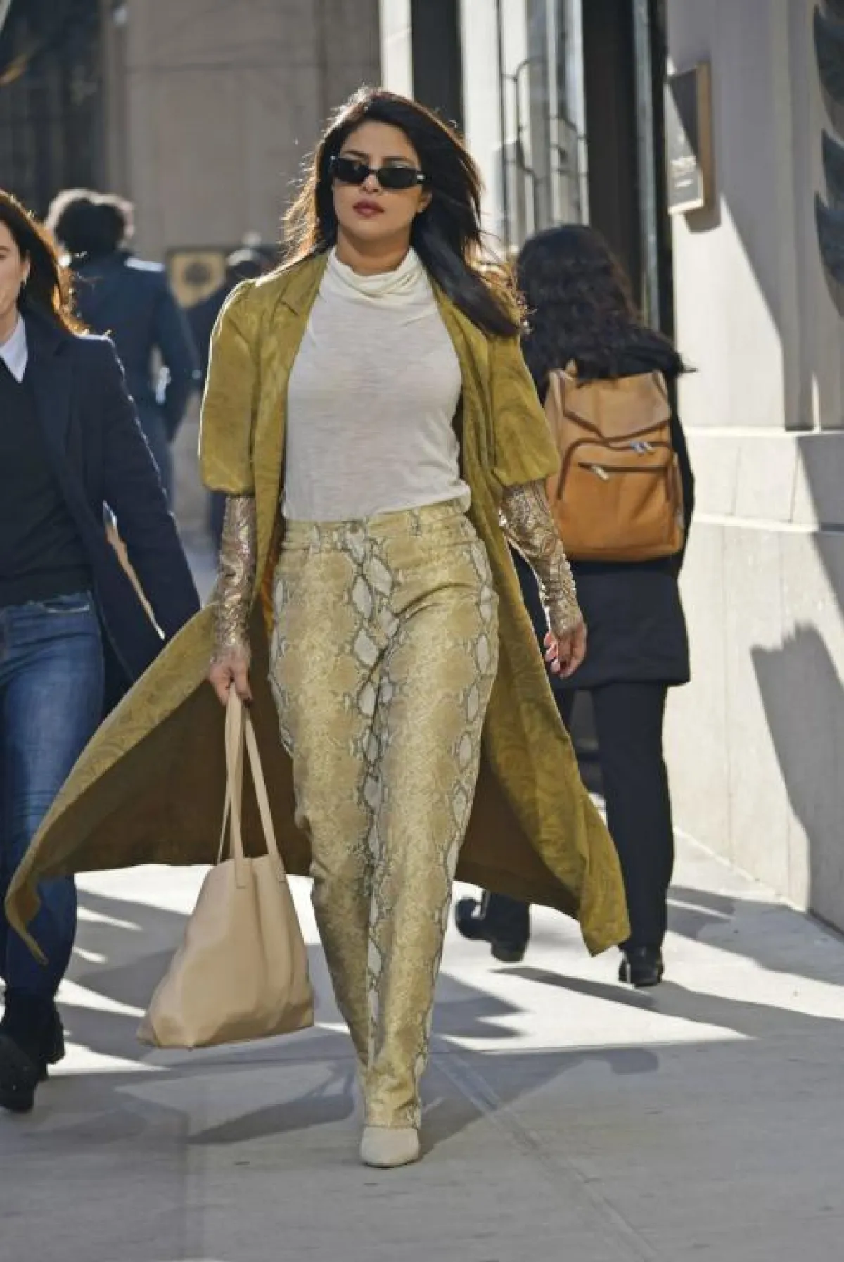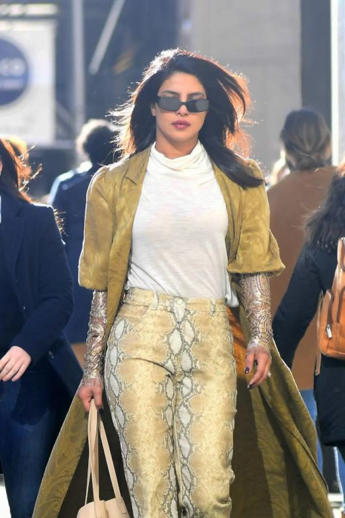 كذلك أحببنا الاطلالة العصرية التي أطلت بها “بريانكا شوبرا” Priyanka Chopra، حيث اختارت بنطلونًا قماشيًّا بنقشة جلد الأفعى، نسقت معه توب بياقة عالية باللون الأبيص، ومن فوقها ما يشبه القفطان الحريري باللون الذهبي، وقد اختارته من علامة “مدية الشرقي” Madiah Al Sharqui الإماراتية، وأكملت الاطلالة باكسسوارات باللون البيج الفاتح.