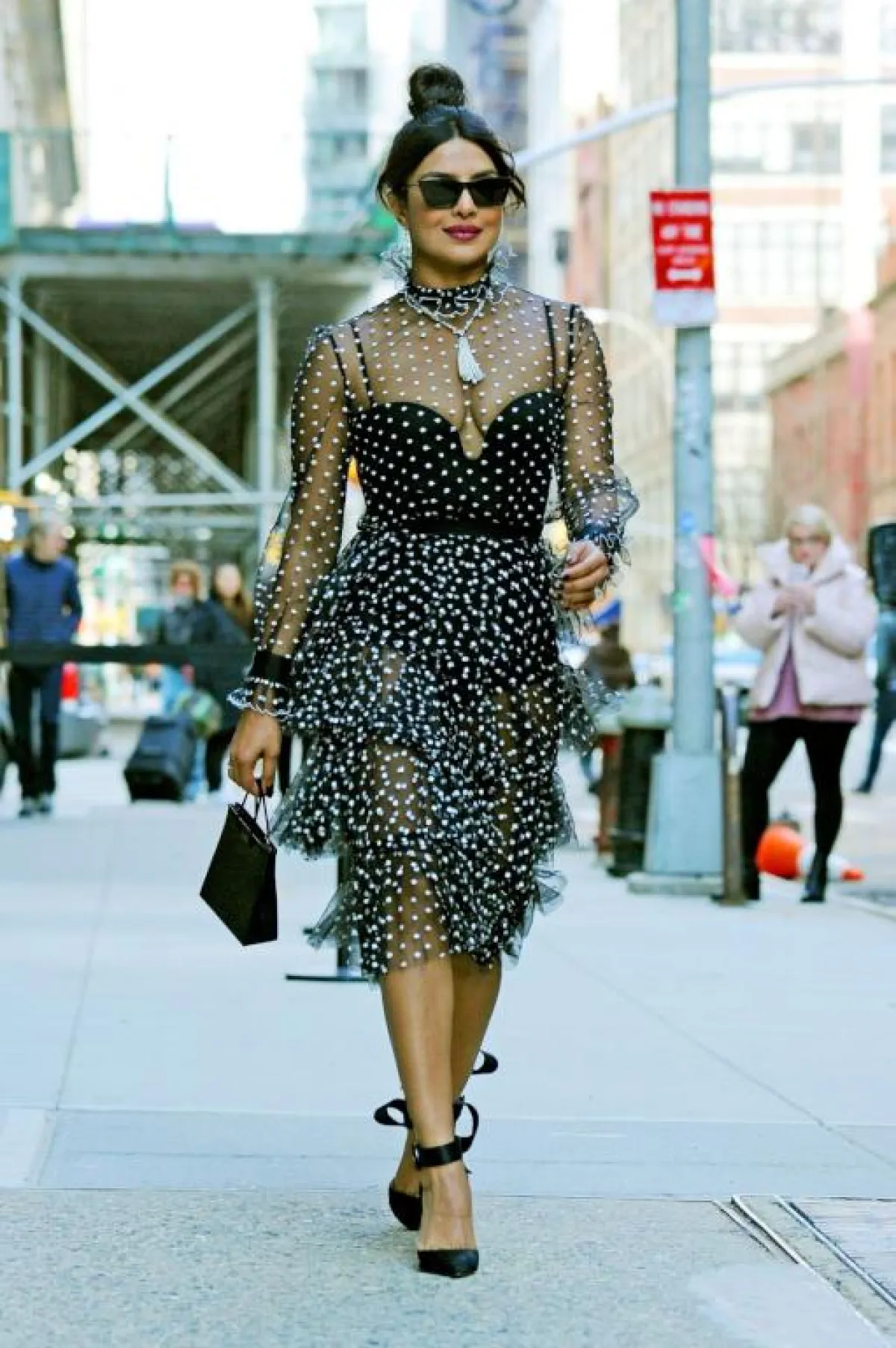 إحدى أجمل الاطلالات التي رصدناها لـ “بريانكا شوبرا” Priyanka Chopra في نيويورك، كانت هذه التي اختارت فيها فستانًا بتصميم أنثوي من قماش التول باللون الأسود، مزينًا بالكشكش، اختارته من “فيلوسوفي دي لورينزو سيرافيني” Philosophy di Lorenzo Serafini وقد نسقت معه شنطة يد صغيرة باللون الأسود، وحذاءً بكعب عالٍ بتصميم مبتكر، مزينًا بشريطة من “كريستيان لوبوتان” Christian Louboutin، وأكملت الاطلالة بعقد لافت من اللؤلؤ والماس.