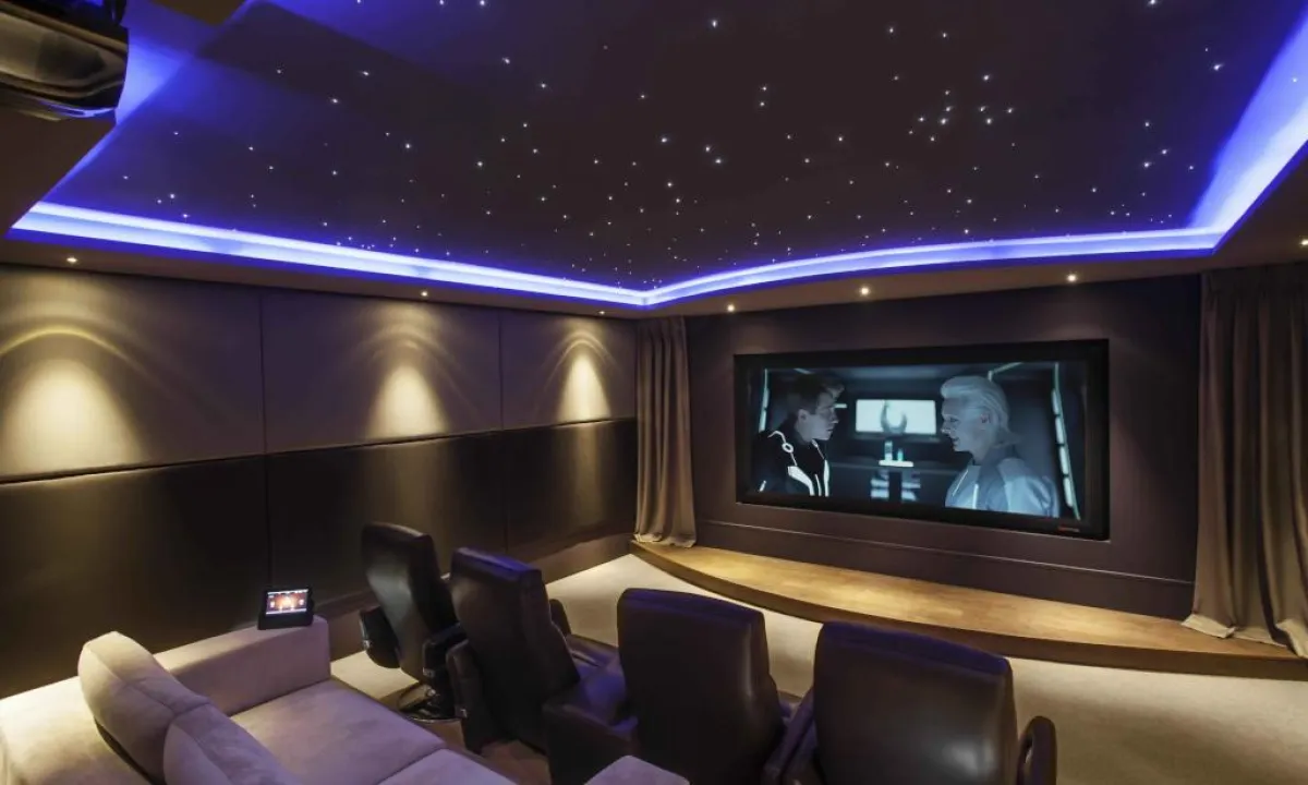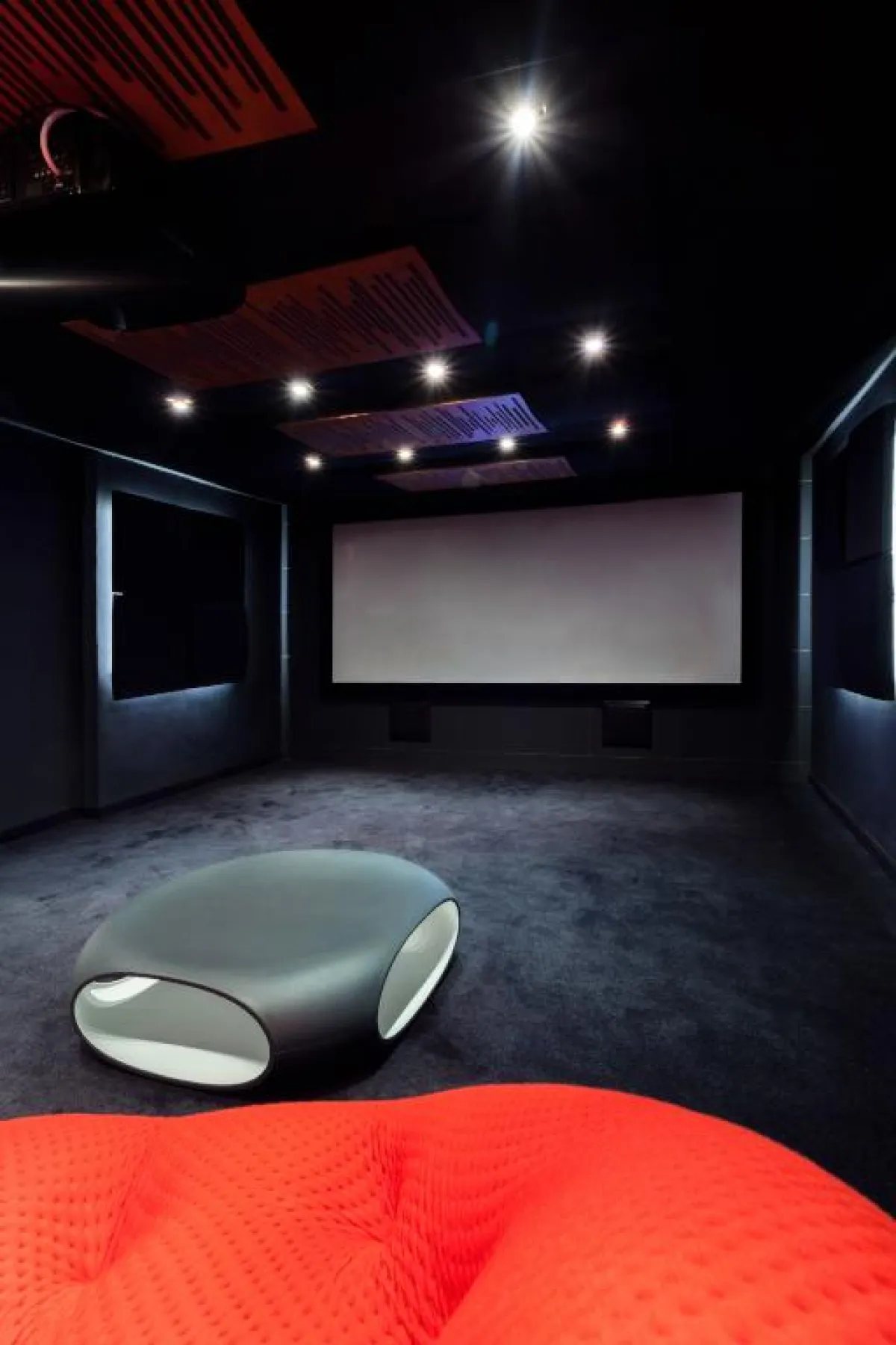 3. إذا خُصِّصت غرفة مستقلَّة للسينما المنزليَّة، فقد تحاكي هذه الأخيرة صالة السينما في الـ"مول"، عند الحرص على اختيار مجموعة من المقاعد المفردة المريحة لها، وغالبًا من الجلد، وشاشة مسطَّحة ضخمة. وفي شأن الجدران، تنصح الزهراني بتوظيف اللون الأزرق في الطلاء، كما في الإضاءات المخفية، ليندمج أفراد العائلة بالفيلم بصورة تامَّة، لأنّ الأزرق يوحي بالراحة. ويجذب أيضًا، استخدام الوسائد والأغطية الزرق على المقاعد المريحة، ليشعر كلُّ من يدخل هذه الغرفة كأنَّه في صالة سينما حقيقية. ويحلو ترصيع السقف بالنجوم اللمَّاعة لإعداد جوٍّ سينمائي كلاسيكي.