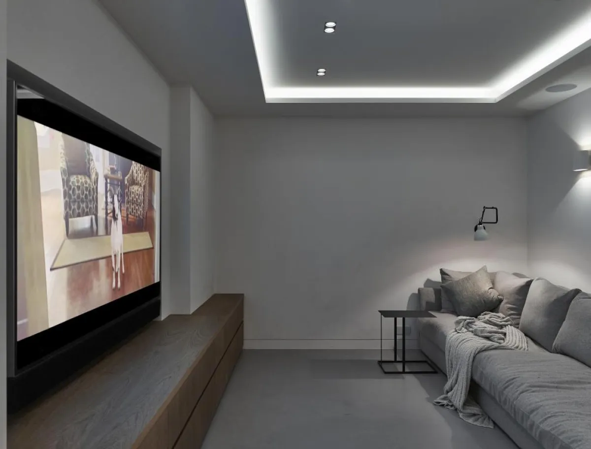2. في بعض المنازل، يتمثَّل الهدف من حضور صالة السينما، في استغلال مكانٍ منسيّ بالمساحة، مثل: الركن تحت السلالم، مع فرشه بما يناسبه لناحيتي المساحة والديكور. وفي هذا الإطار، يتمّ اختيار أثاث صغير الحجم ومتحرِّك، كيلا يعرقل الحركة.