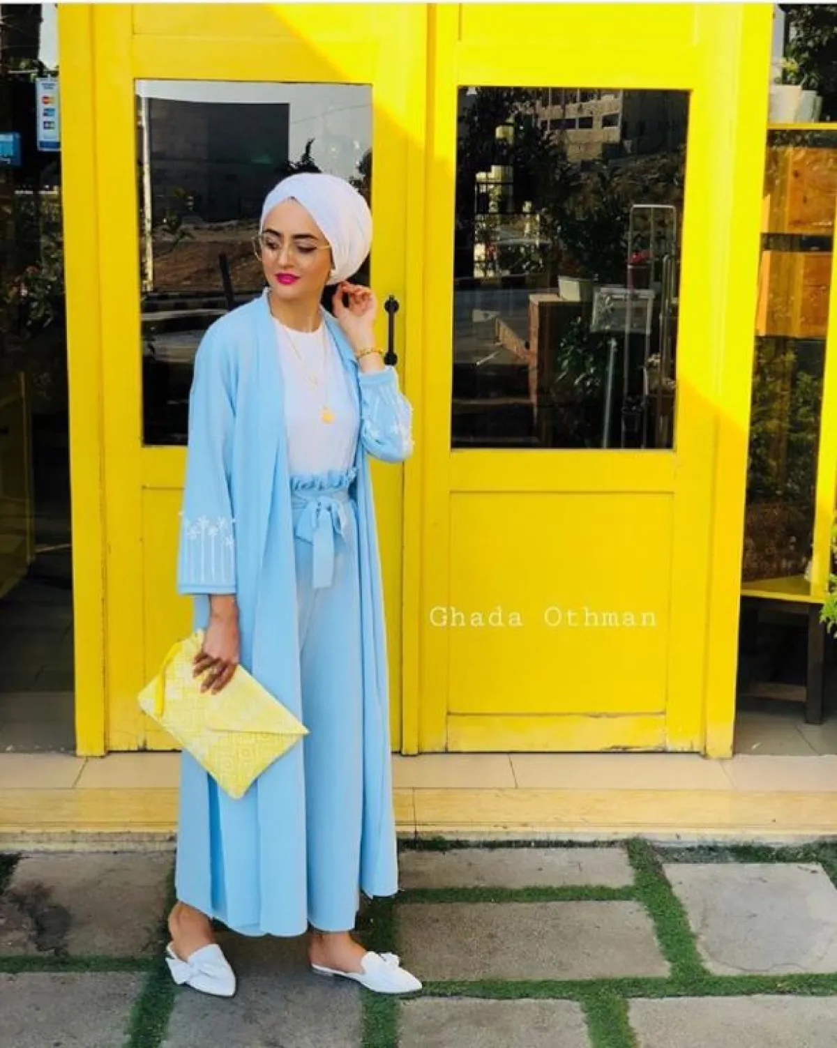 من القطع الأساسية بخزانة أيّ صبيّة هي البناطيل الواسعة، بخاصة الصبيّة النحيفة من منطقة الأرداف، يمكنكِ إخفاء هذا العيب باعتماد البناطيل الواسعة، والخصر العالي لن يجعل جسدكِ يبدو كقطعة واحدة، اعتمديه مع الكادريغان الطويل لـ اطلالة محتشمة، كهذا الستايل من غادة بالبنطلون البيبي بلو مع الكادريغان الطويل والتوب الأبيض.