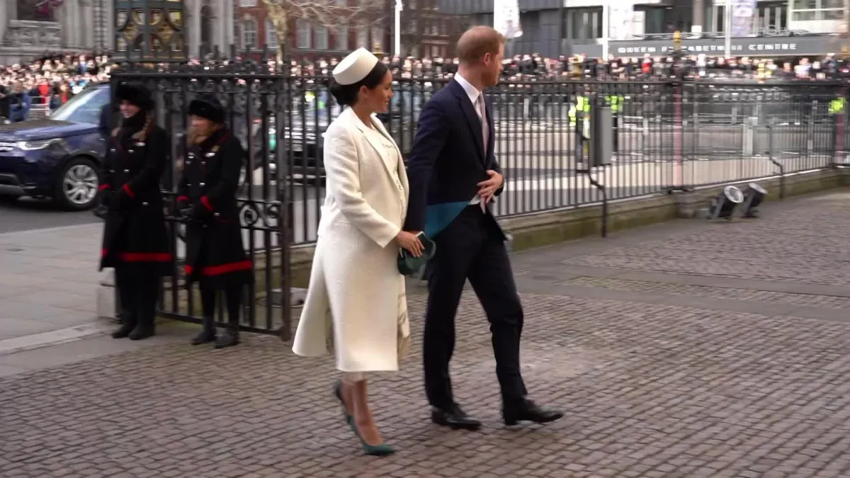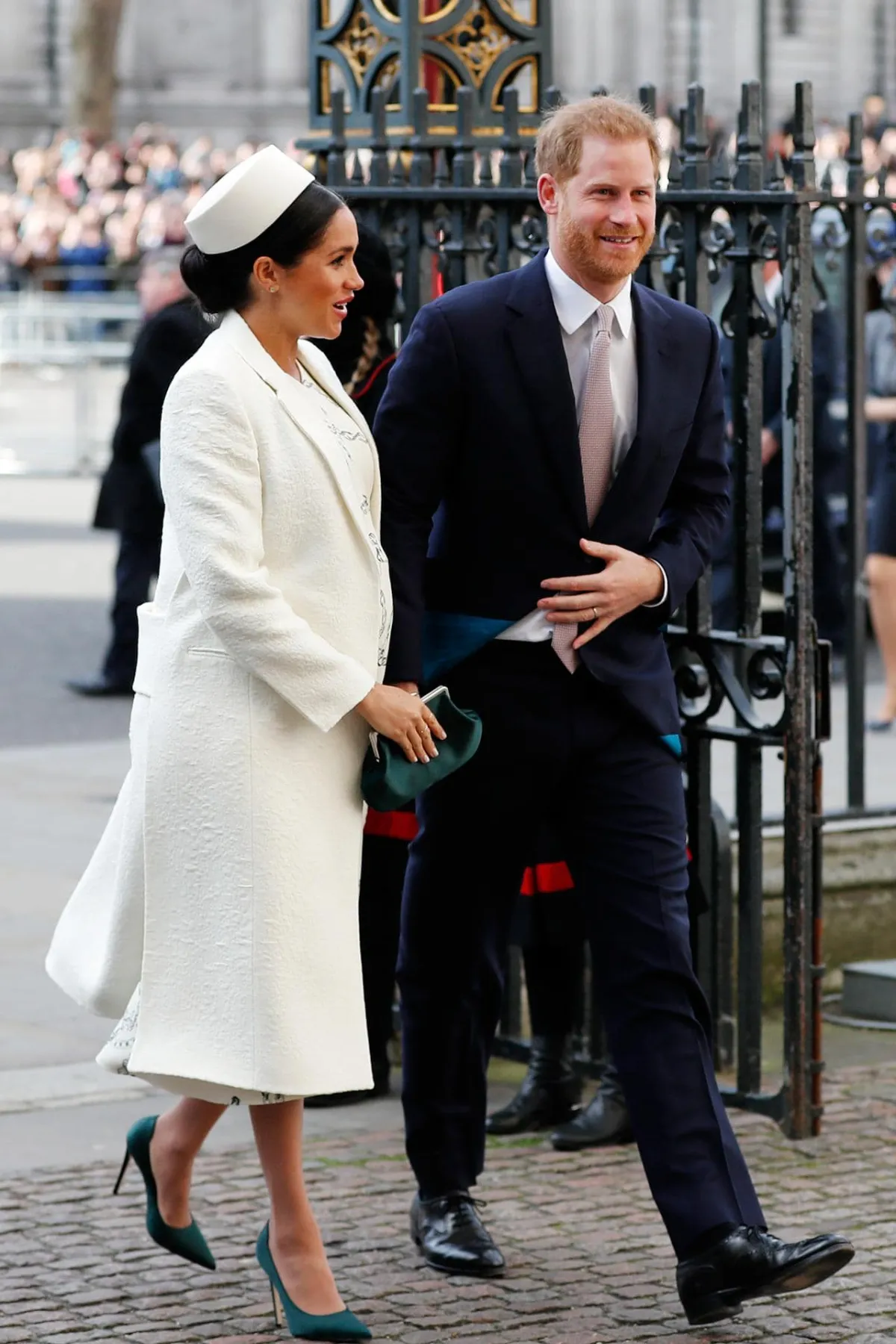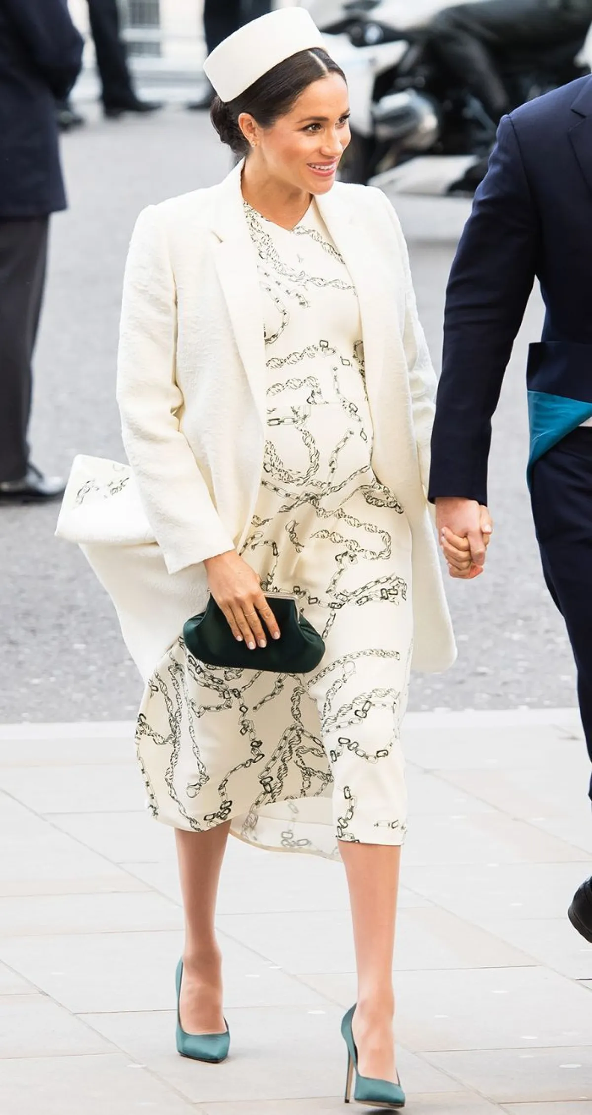 خلال احتفالية الكومنولث، اختارت ميغان ميركل فستان حرير مُطبّعًا بالسلاسل المعدنية على خلفية بيضاء. الفستان بتوقيع دار أزياء فيكتوريا بيكهام، التي أصبحت من المصممين المقربين لأسلوب ميغان ميركل. نسقت معه معطفًا باللون البيج الفاتح، وقبعة مستديرة مستوحاة من أسلوب نساء القصر الملكي، فيما انتعلت زوجًا من أحذية الـ pumpمن جلد الشامواه باللون الأخضر الداكن.