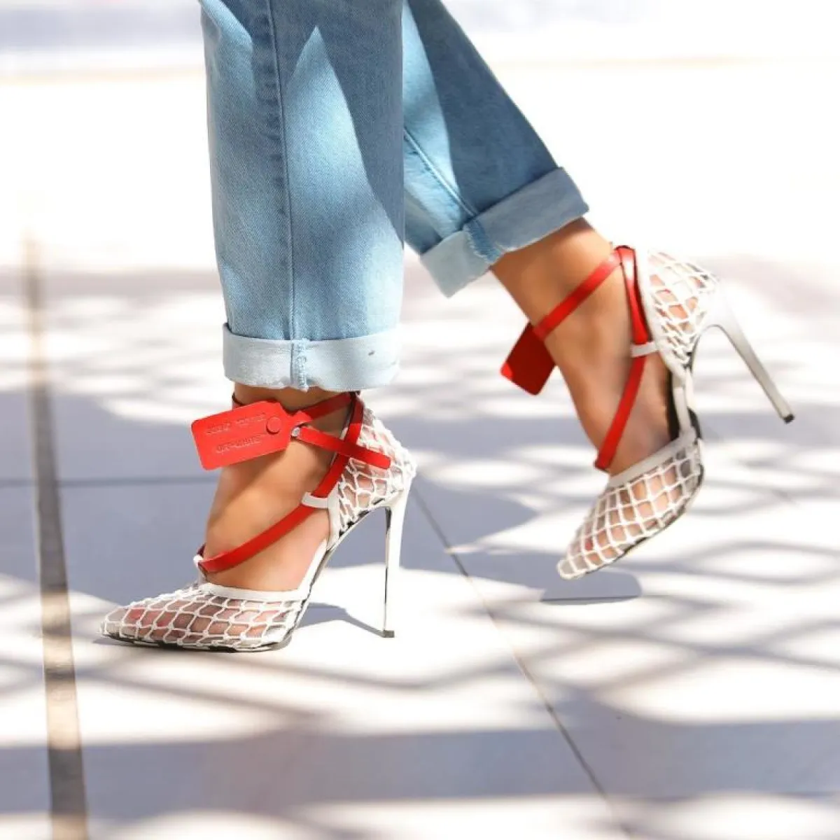 انتعلت مرمر أيضًا زوجًا من الأحذية البيضاء، المستوحاة من صيحة الشبكة التي تصدرت ممشى العروض هذا العام، كما زُينت بحزام جلد أحمر حقق تباينًا خلاقًا يجذب النظر للقدمين.